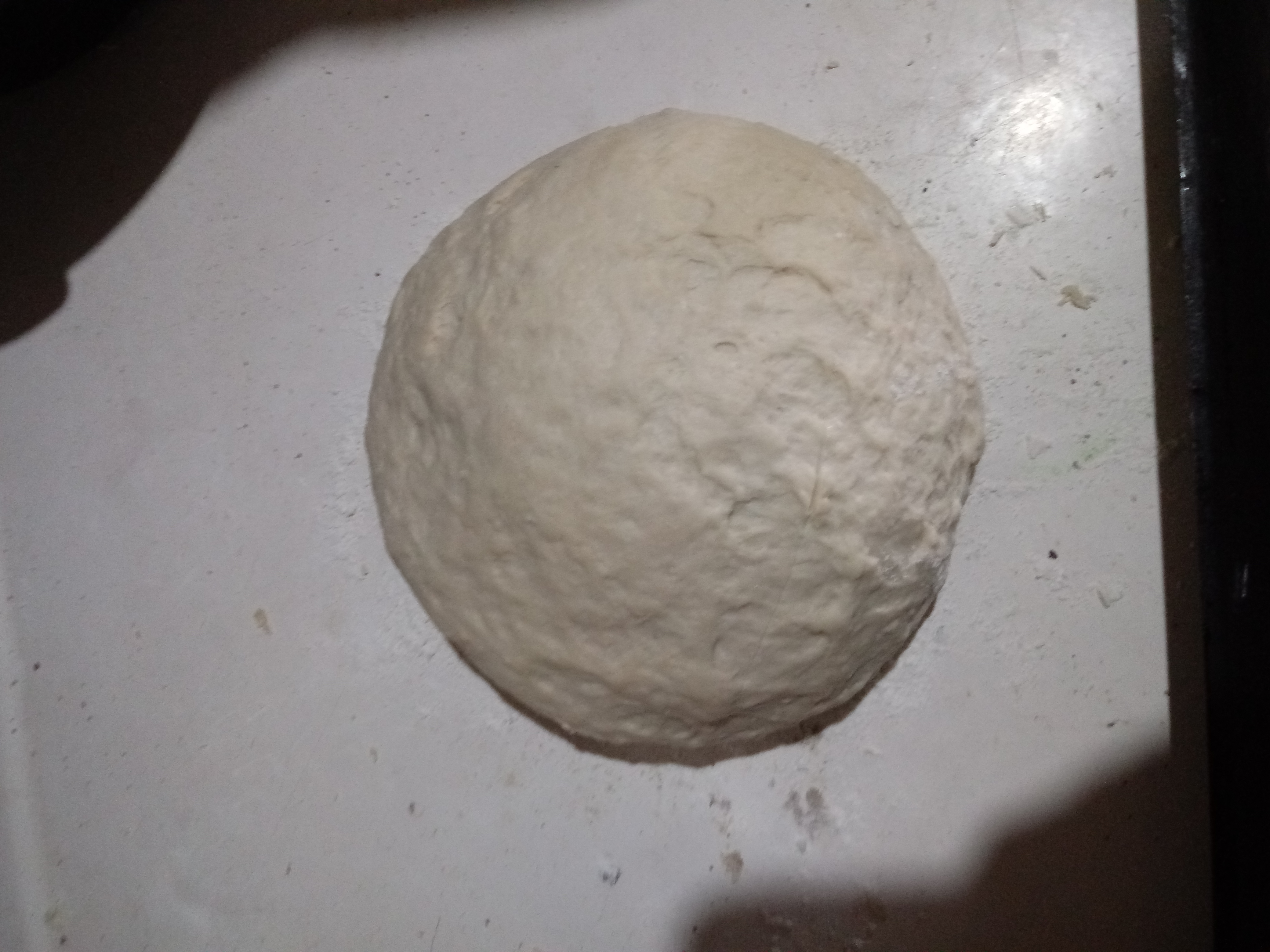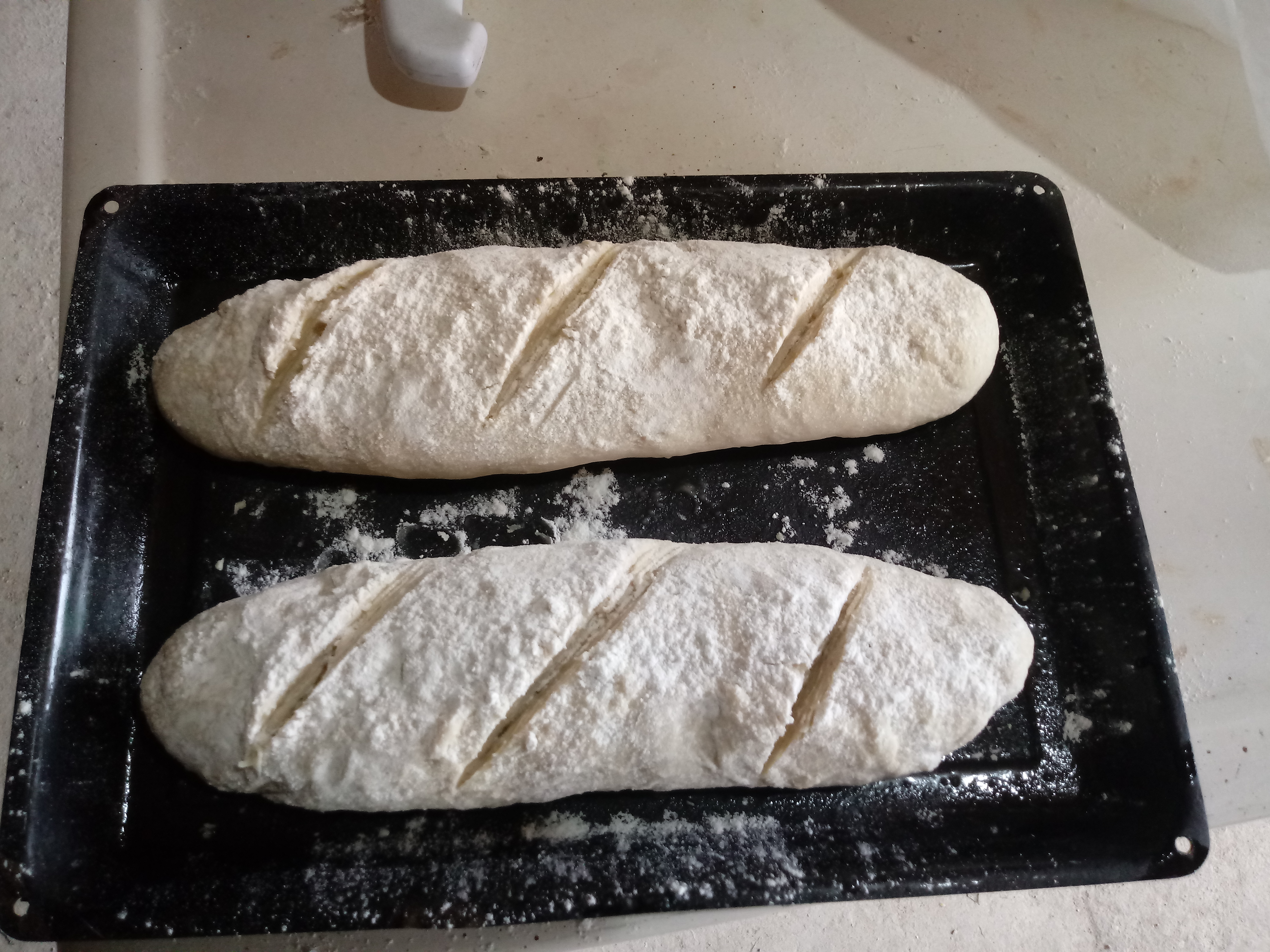 5.- Unta un poco de aceite en la bandeja para hornear. Tras 30 minutos, la masa ya está lista para hornear. Unta tus manos con aceite y quita el aire al pan. Pasa a la bandeja de horno y, con un cuchillo, hazle un par de cortes.