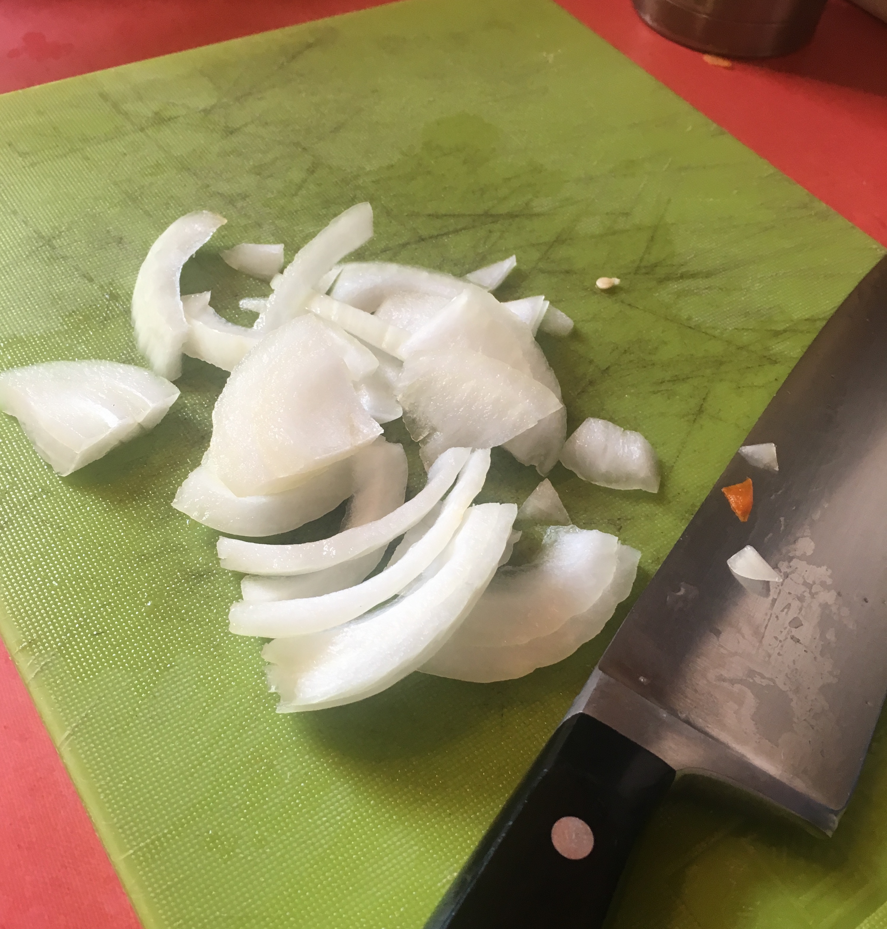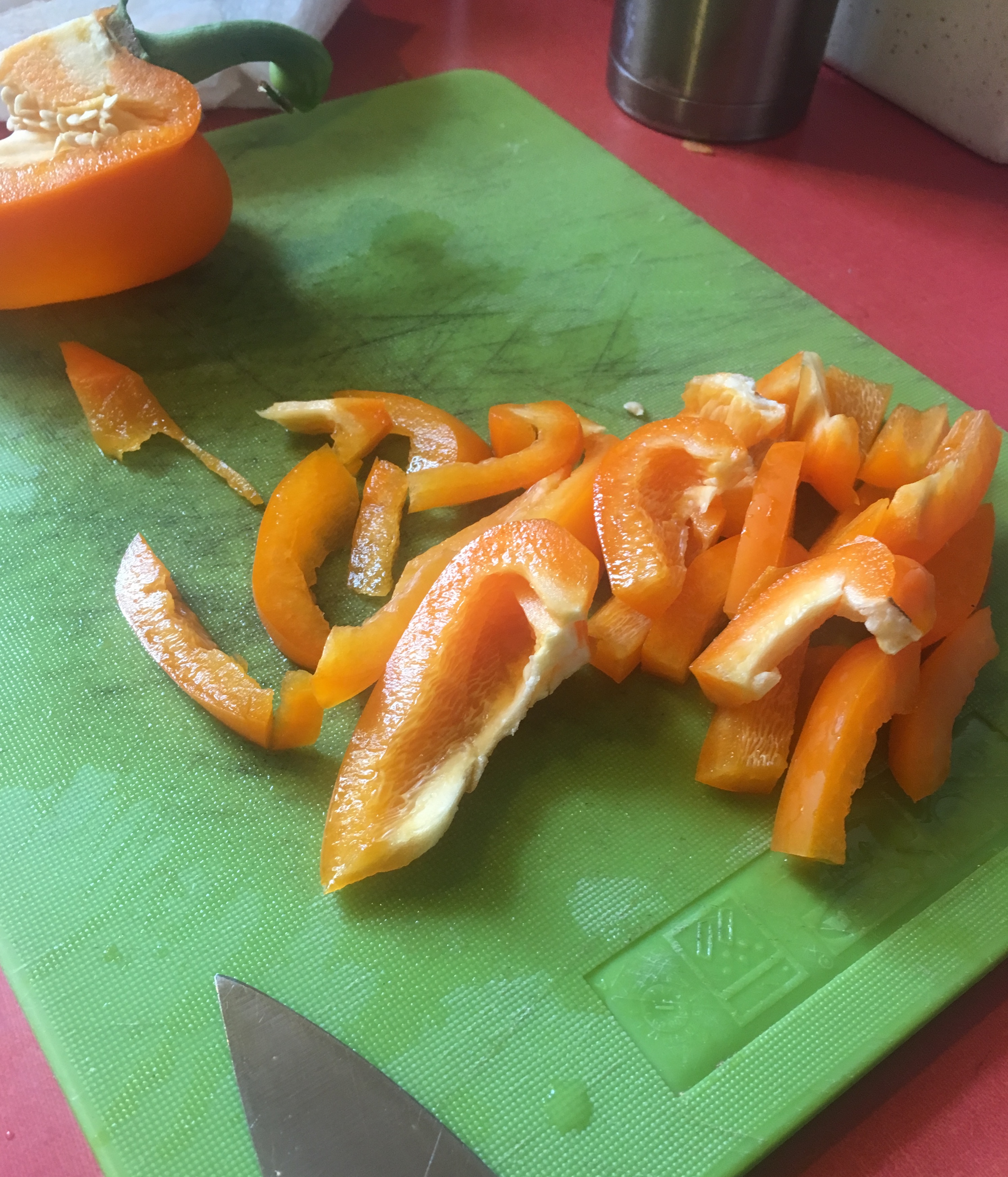 Slice onions, and peppers. Save most of the peppers and onions for the pan.