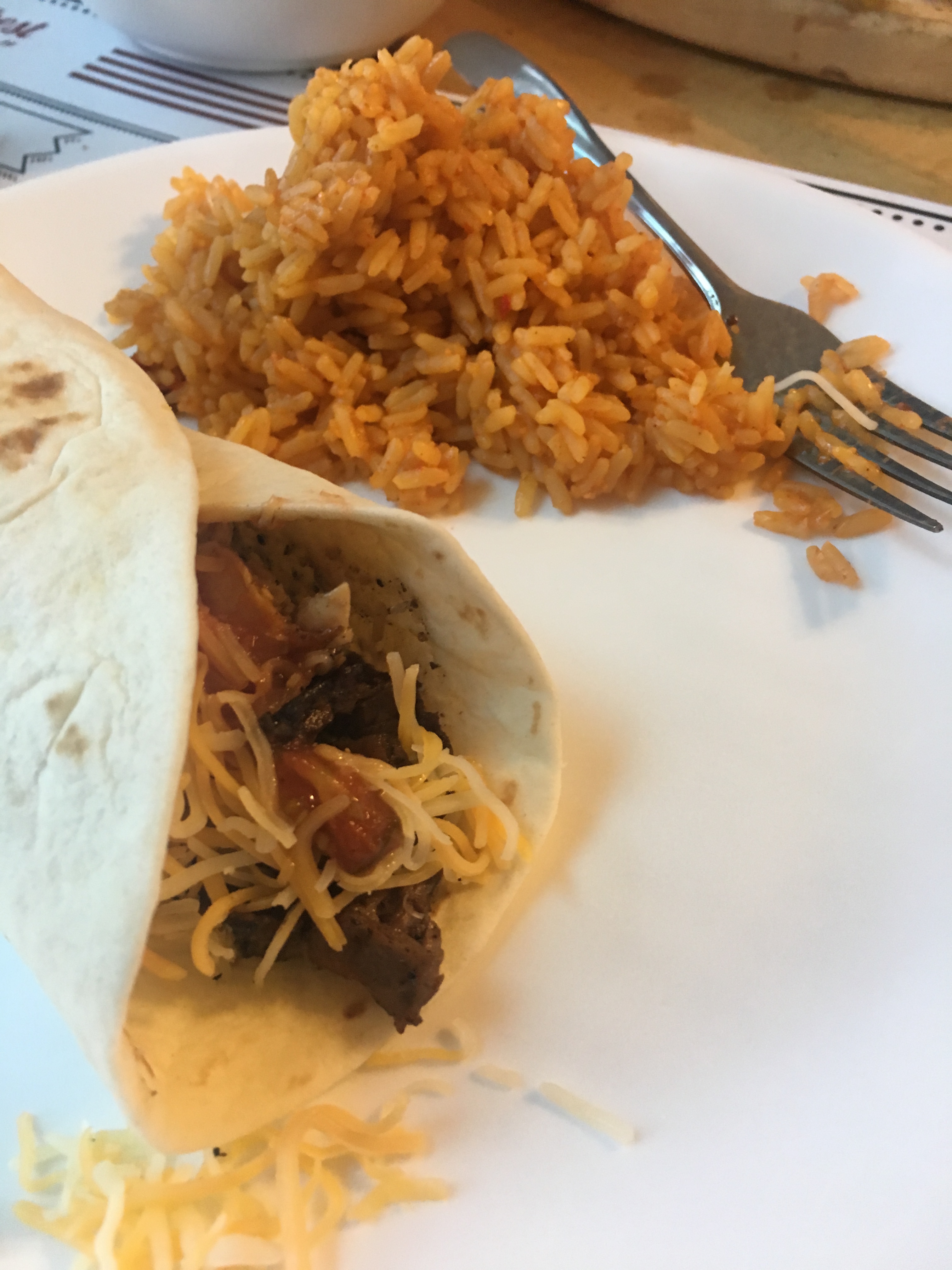 Take the tortillas out of the warming oven, and serve each person one tortilla, and a bit of Spanish rice. Prepare your tortilla your own way! For me, Sour cream, Shredded Cheese, Some Pico de Gallo, and Meat, wrapped in the tortilla!