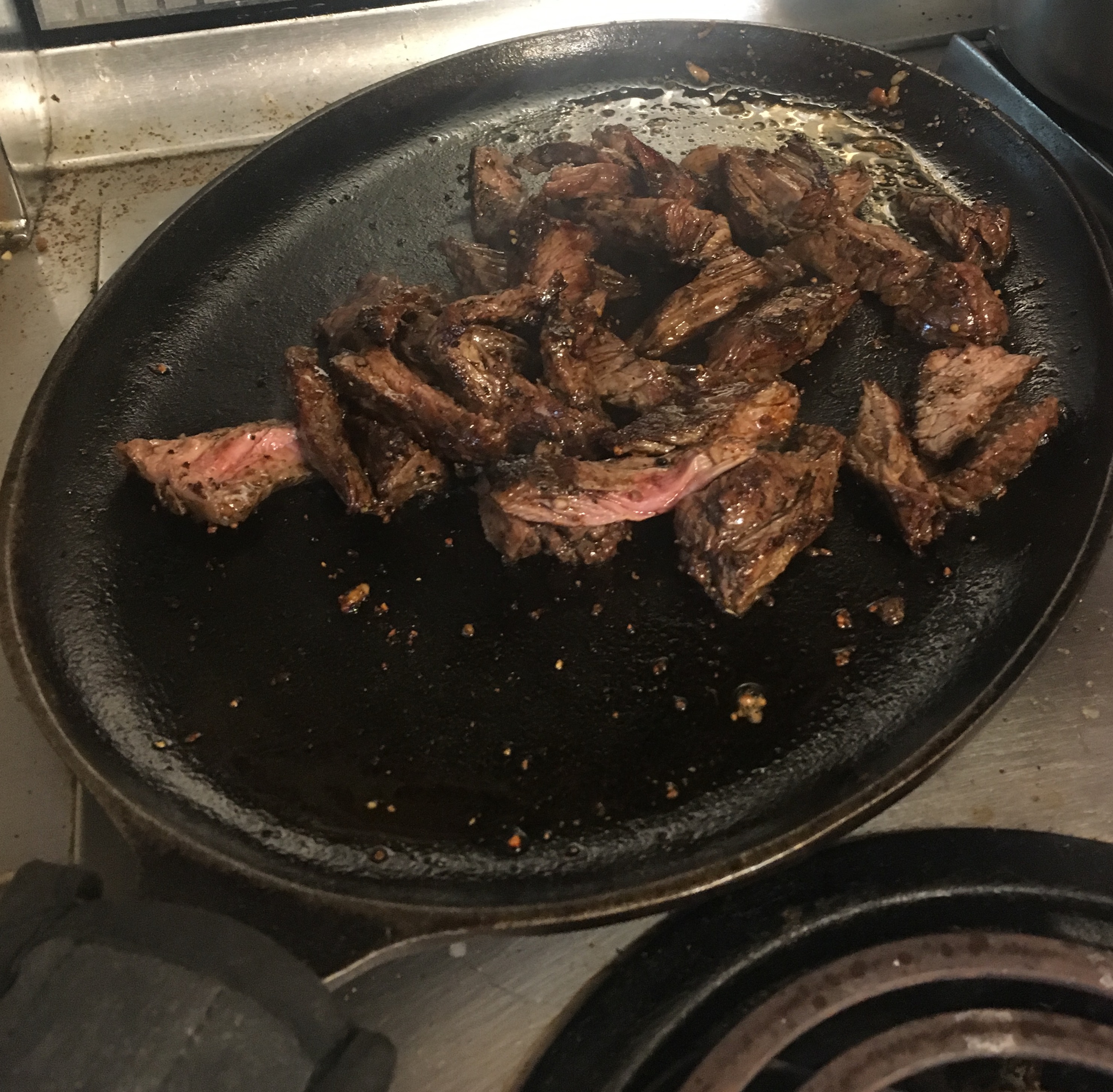 Put all the meat back on the Cast Iron Pan, and add the peppers and onions! Reheat it all for 30 seconds, and add some Fresh Lime juice and wedges to the hot pan!