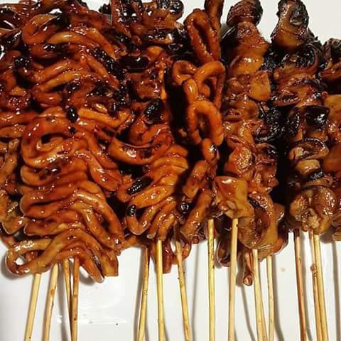 Isaw is a street food from the Philippines, made from chicken intestines. The intestines are cleaned, turned inside out, and cleaned again, repeating the process several times; they are then either boiled, then grilled, or immediately grilled on sticks. They are usually dipped in vinegar with onions, peppers, and other spices. They are usually sold by vendors on street corners during the afternoons especially in Opon Cebu