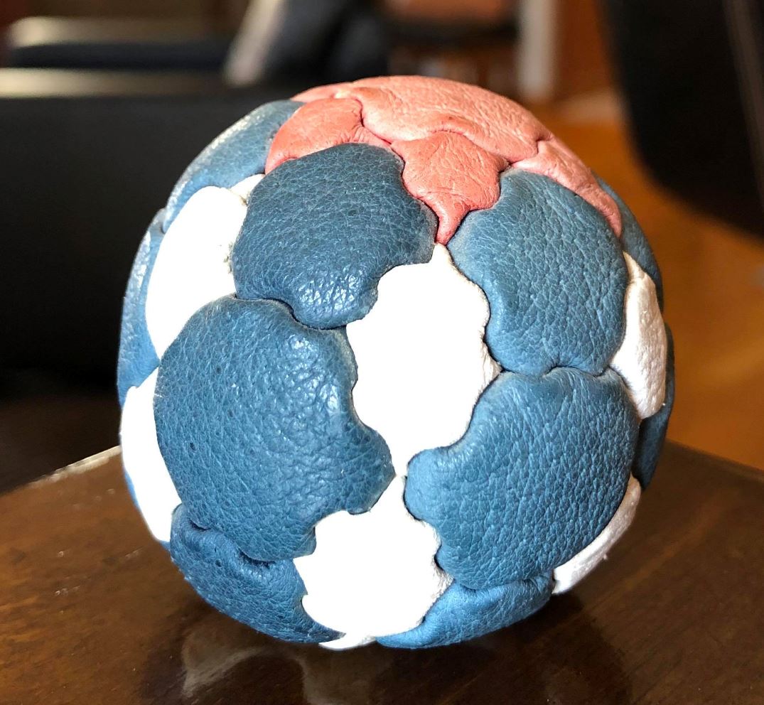 The Sunburst is an incredibly unique design: it's made up of 44 panels, sporting four different shapes and two six-pointed stars! Those four shapes are the following: 8 hexagons, 12 pentagons, 12 triangles, and 12 diamonds. I've only sewn one or two other footbags in my entire career that utilized four shapes. Crazy!