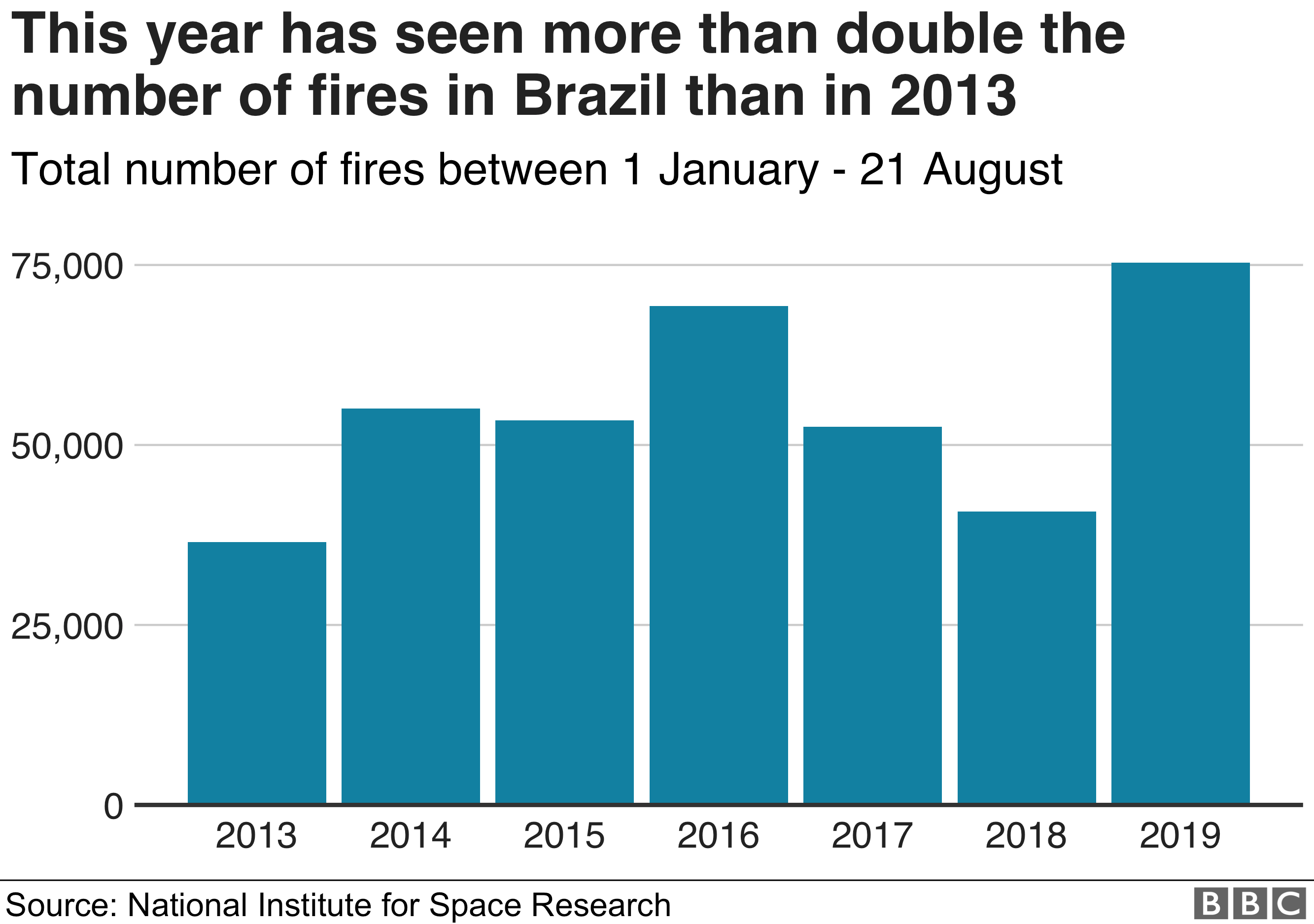 The official figures show more than 75,000 forest fires were recorded in Brazil in the first eight months of the year - the highest number since 2013. That compares with 39,759 in all of 2018.