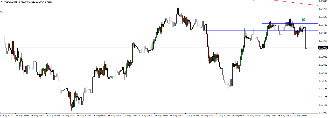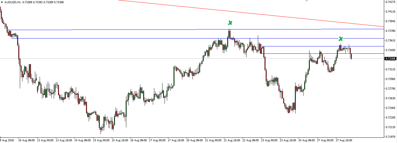 Taking a quick look at where each pair is sitting, it's the Aussie that caught my attention the most. Check out these intraday areas of previous support turned resistance that price has been reacting around:
