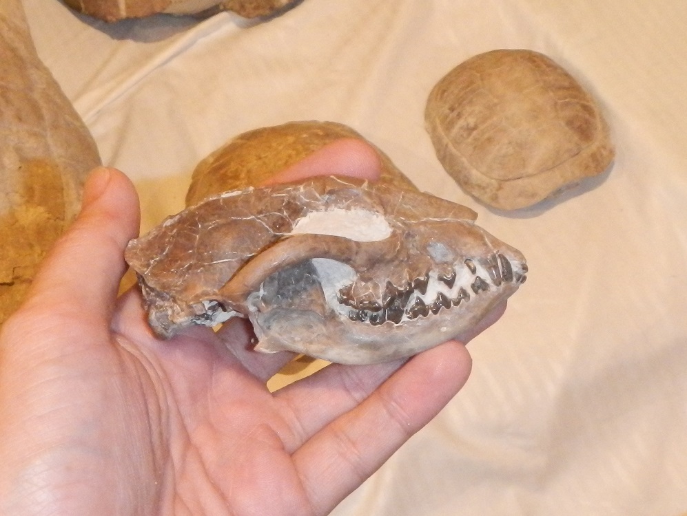 Here is a picture of a hesperocyon skull. The whitish area is what was exposed when found and bleached by the sun. This skull would be from an adult animal and should give you a good idea of the size of these first true dogs