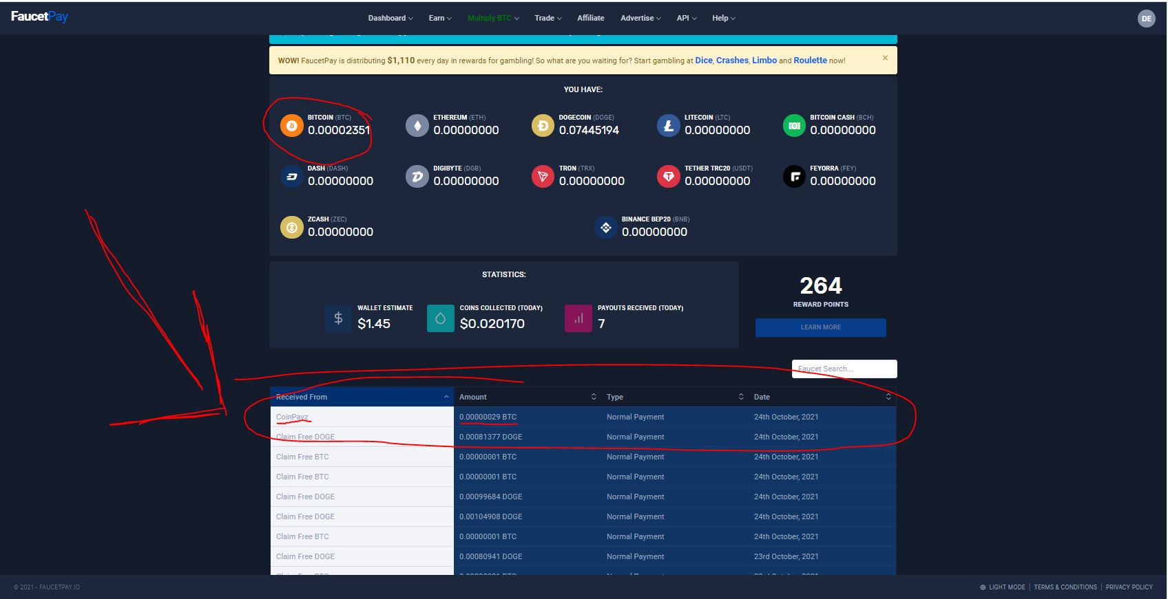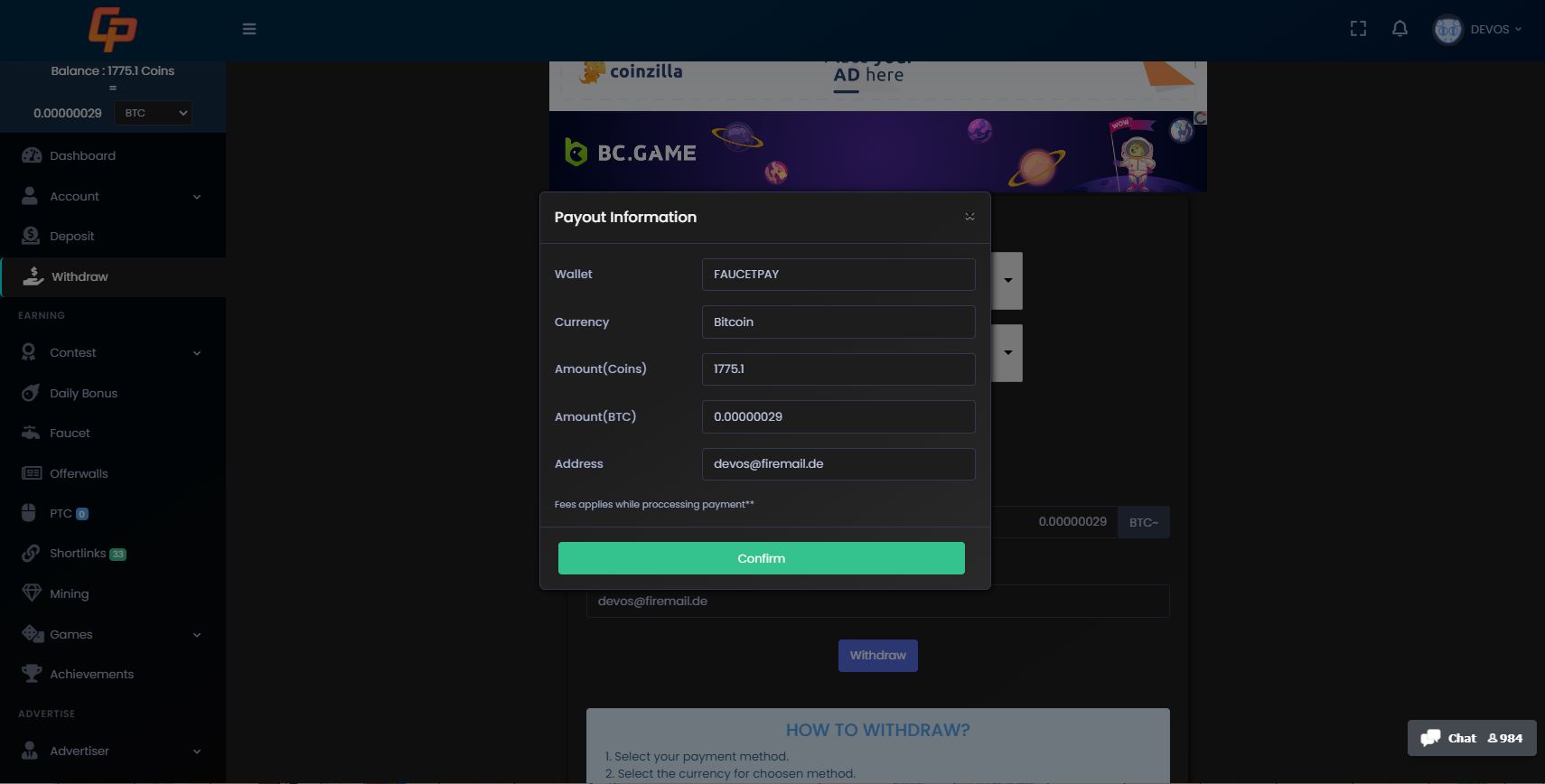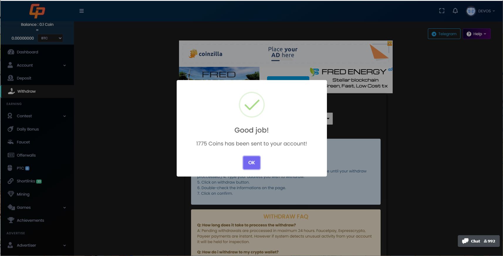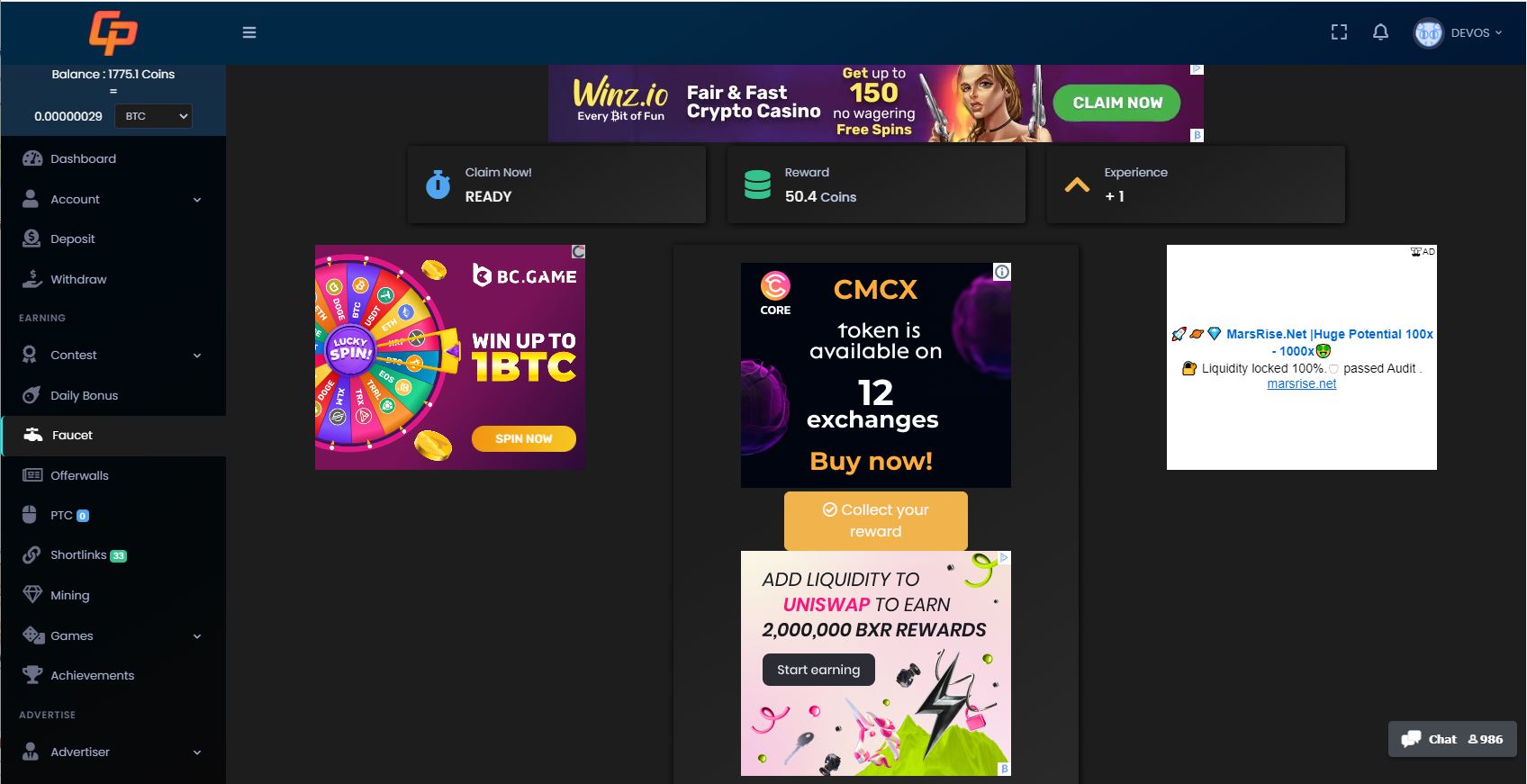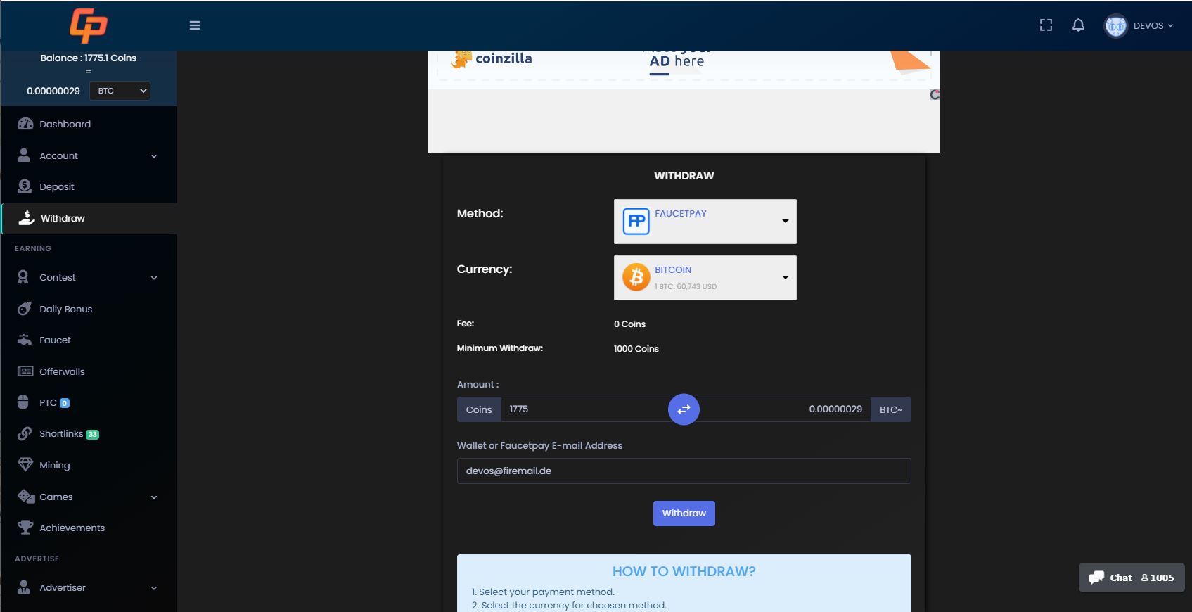 You earn coins that are tied to the USD and after reaching a specific amount you can withdraw to FaucetPay, Payeer or direct to your wallet and some other methods.
