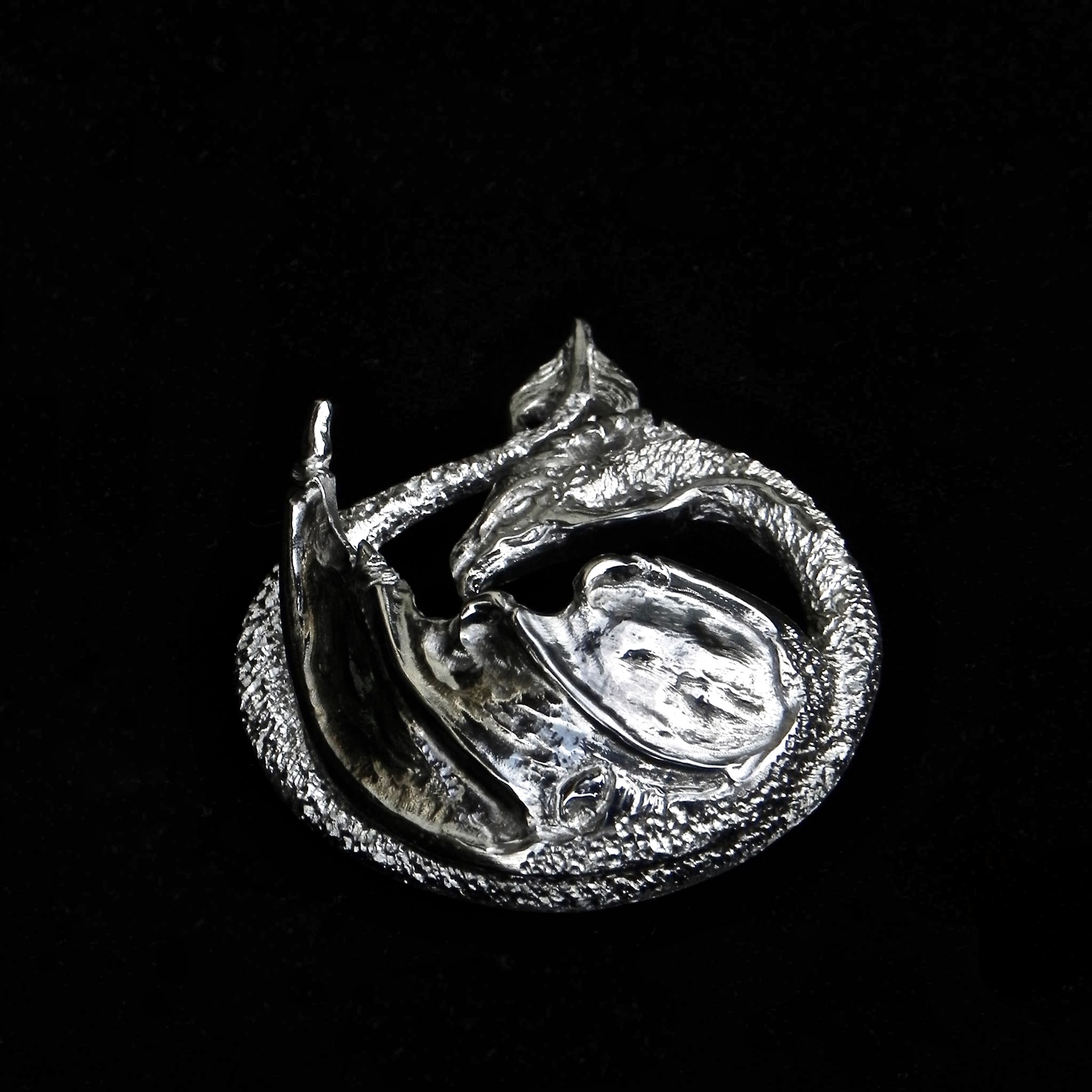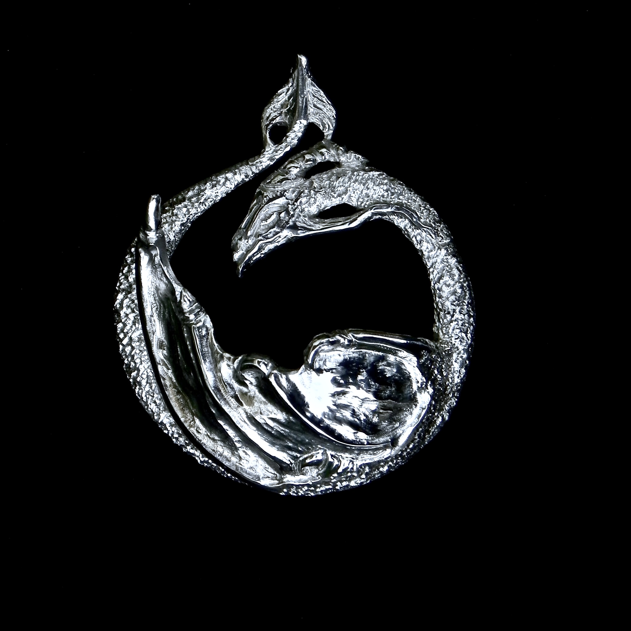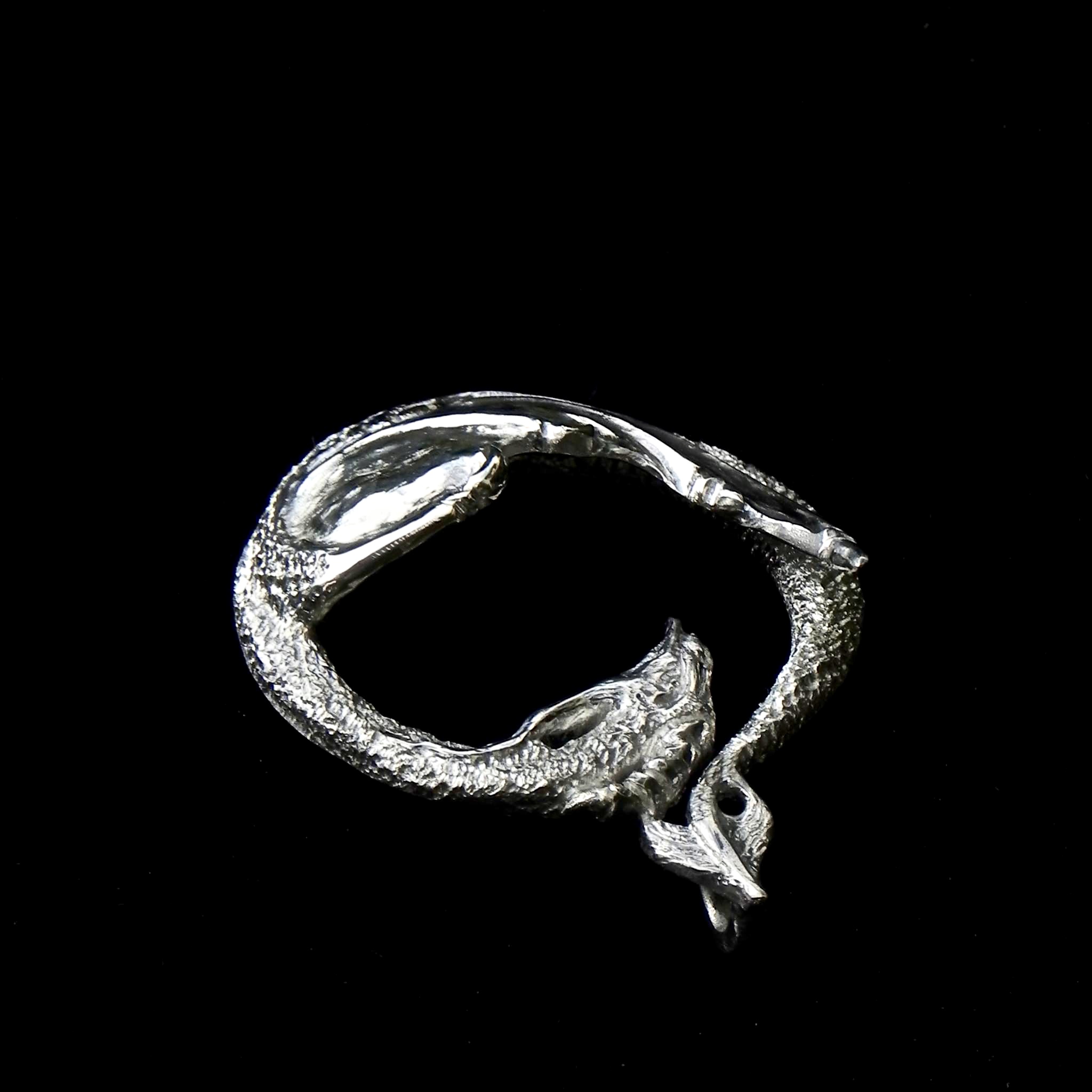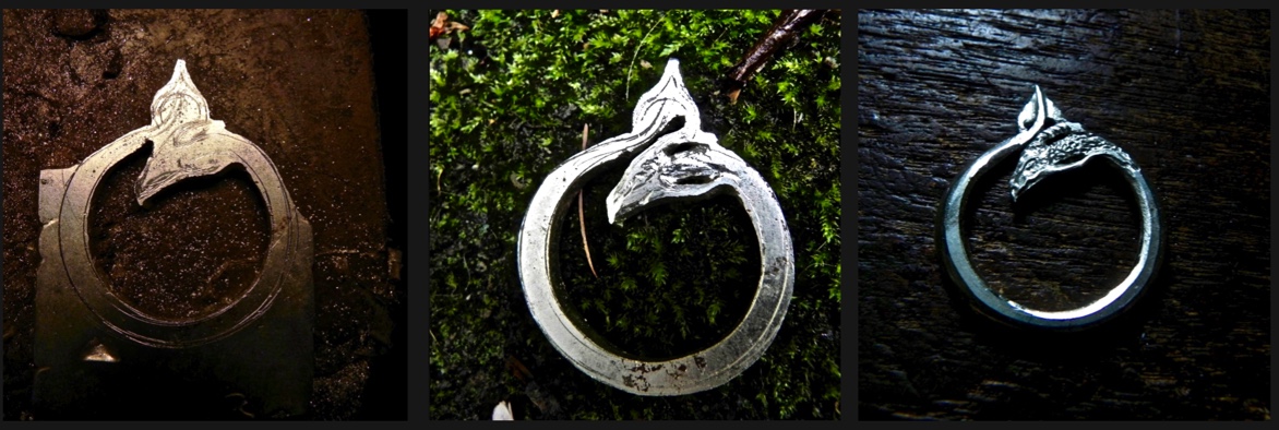 It’s a theme I love exploring in the three dimensional realm of precious metals as well. The idea for the Silver Dragon came from several influences; first the acrobatic flight of several bird species (Swallows, Birds of prey and Starling murmurations) and of course the world of animation. Specifically the fantastic dragon dance in Avatar: the Last Air Bender and the swirling flight of Haku in the brilliant Miyazaki film “Spirited Away”. I wanted to recreate that joy, that frenetic, powerful energy that can be found in the freedom of flight. To capture a moment in that flight that draws statis and movement into one, into a moment of suspended equilibrium of shape and form. A circle seemed most fitting to convey this. The drawing for the dragon was done freehand onto a thick plate of sterling silver (4mm).( I seldom sit and pre-draw my designs. I see it in my head and transfer it directly onto metal.) Sawing a design out of thick plate usually takes much longer, and one tends to go though more blades than one would like. But working with this thickness has its sculptural benefits. Shaping and deepening form through texture becomes very rewarding as it allows ample surface.