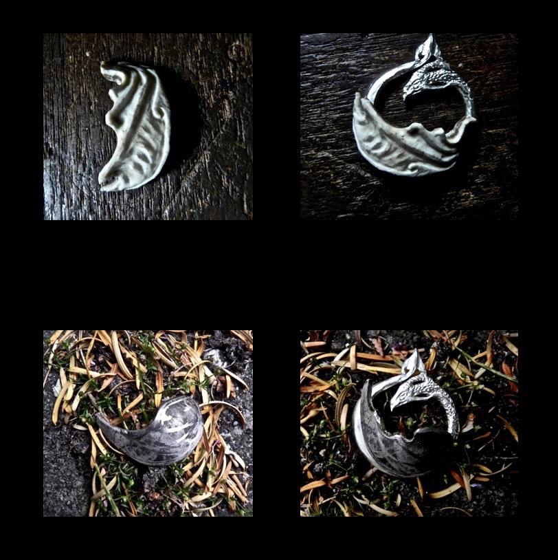 The wing was a different matter. I wanted to recreate a smooth and leathery surface on the wing membrane, such as one sees on bat wings. I also wanted the ridges of the wing “fingers” to really stand out, ending in talons. Initially, I thought I’d make it out of red deer antler. After I did a very rough shaping of the wing and held it to the dragon’s body, I saw that it just didn’t fit the overall design and feeling of the piece at all. So, on to sterling! (I might add that there is always value in exploring options, even if those options aren’t feasible in the end, they can be of worth. Many such explorations have led to nothing and many have led to new ideas and designs. But you’ll never know if you don’t explore.)
