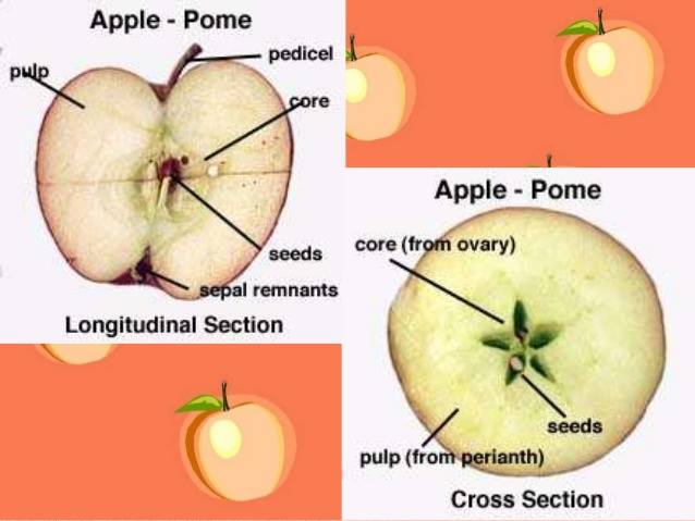 - Pome:- This is the fruit of apple and pear etc.They are derived from syncarpous and bilocular ovary.The outer portion of the fruit is edible while the seeds are enclosed in the center of fruit.The term epicarp, mesocarp and endocarp not applicable to this type of fruits.
