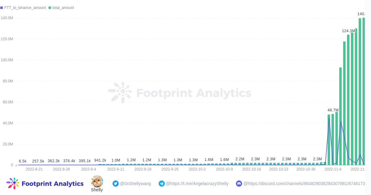 More than 140M of FTT tokens were transferred to Binance from Nov 2 to Nov 8. The jump in transaction volume began on the 5th and 6th, with around 45M and 42M, respectively.