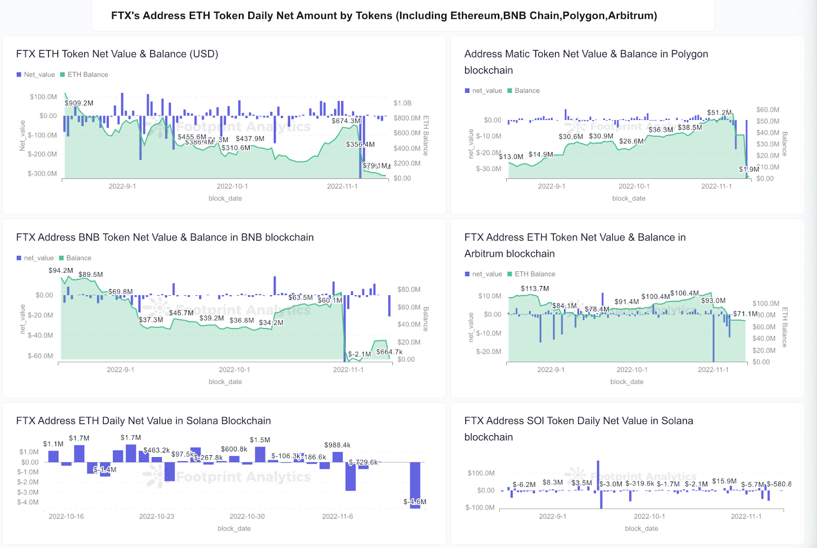 On Nov. 5, 75M FTT was transferred off FTX, indicating a sell-off after this incident. We also witnessed two major dumps on FTT on Nov. 8 & Nov. 13, with around 110M and 211M, respectively.