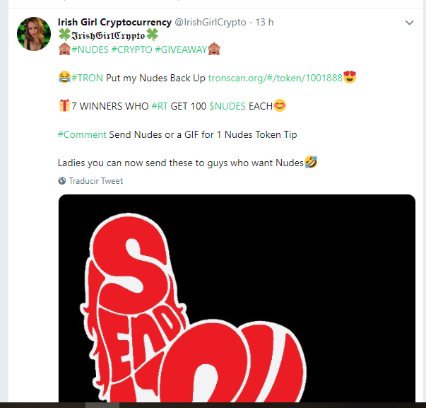 if a fun token created through the network of tron called send nudes to many girls many daring did not bother with this or some are looking for the safe way to make money (I'm nobody to judge) what draws the attention of this token is that the creator made it tired of being asked nudes fed up with this I'm looking for a way to play them a good joke and we go to make them pass a bit of shame