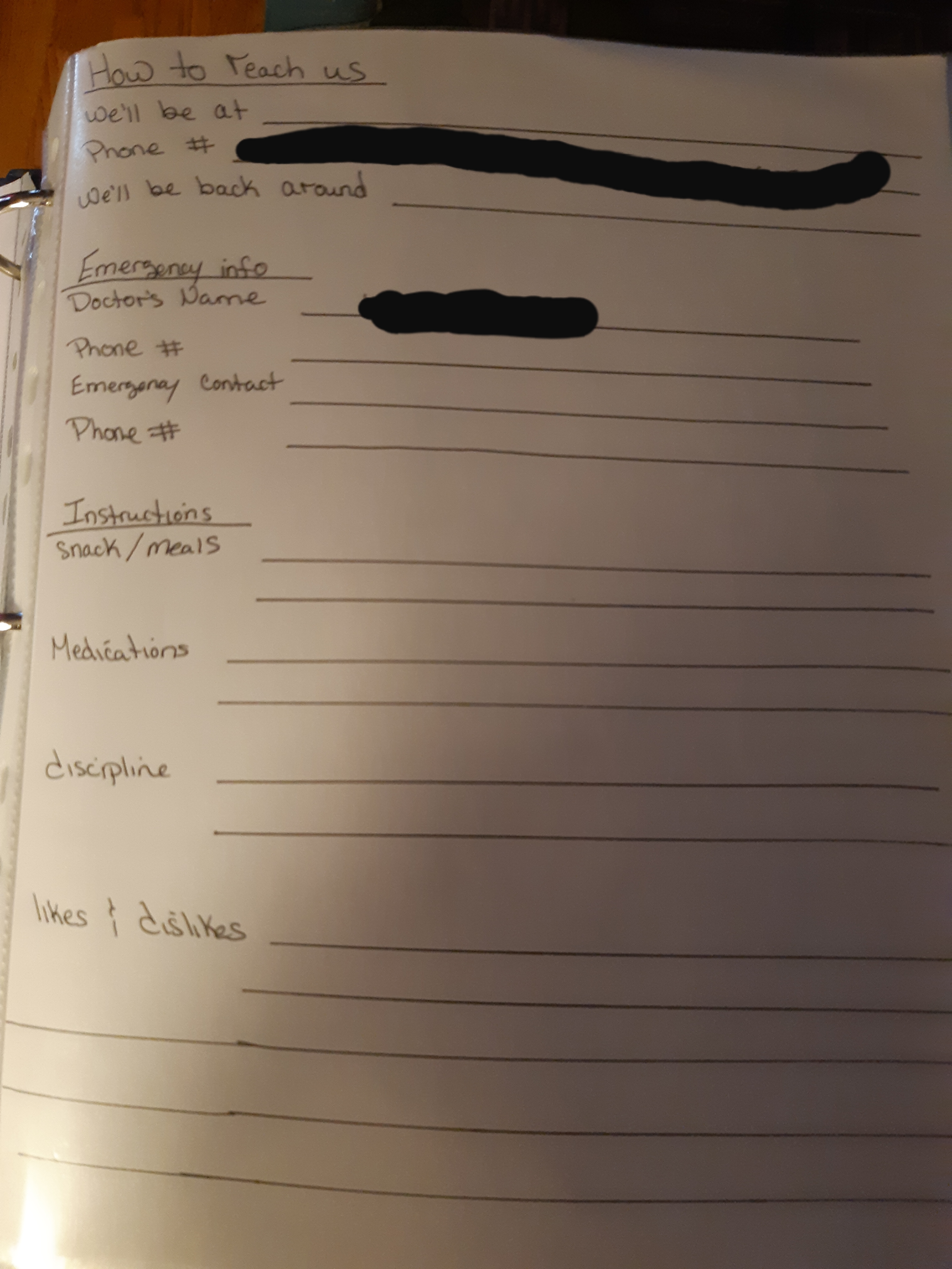 I personally love this sheet as you can detail things you need yout sitter to know but it also has the who's, what's, where's and whys of you while your out and can be used to inform your sitter of dos and dont for your home.