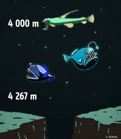 The light of the surface can not reach this point, that's why it is completely dark below. The pressure is the same as if we were on the surface of Venus, that is, it would crush us quickly. Here also begins the habitat area of giant squid.