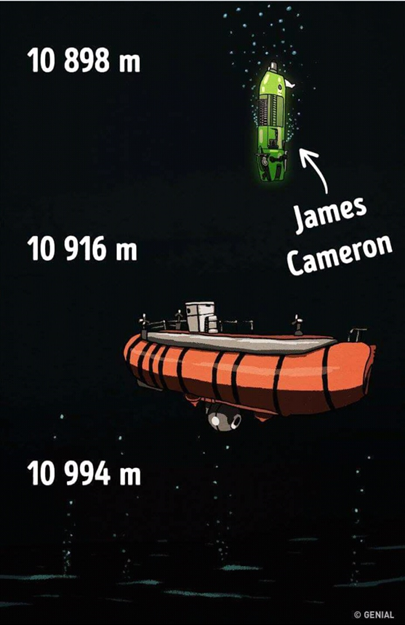 The depth to which director James Cameron submerged in 2012. The submersion lasted 3 hours during which the director observed a completely dark world around him and carried the inflammation in 3D. Cameron was the third person who risked submerging at a depth of 11 kilometers and the first he did alone.