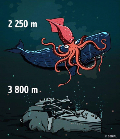 At this depth sperm whales hunt giant squids. From such battles sperm whales often have scars.