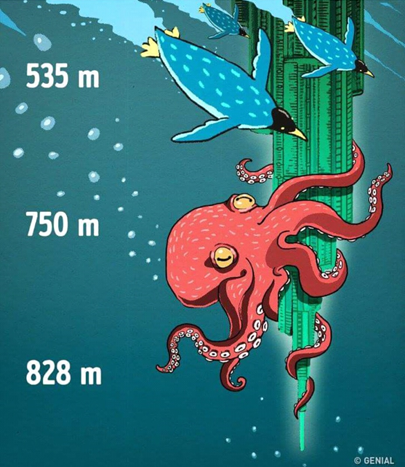 At this depth we could reach the bolt of the overturned tower of Burj Khalifa, the tallest building in the world.