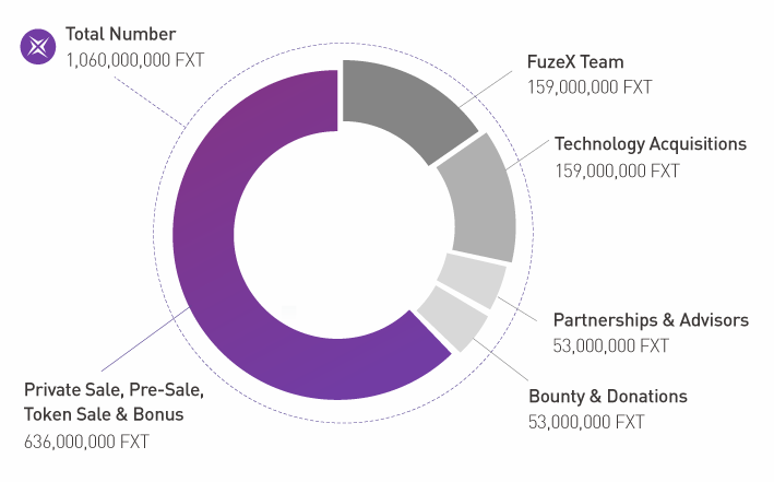 Токены FXT станут криптовалютой FuzeX. В общей сложности их будет 1.600.000.000 FXT. Инвестиции будут использованы для партнерства и дальнейшего развития команды. Распределение токенов можно увидеть ниже: