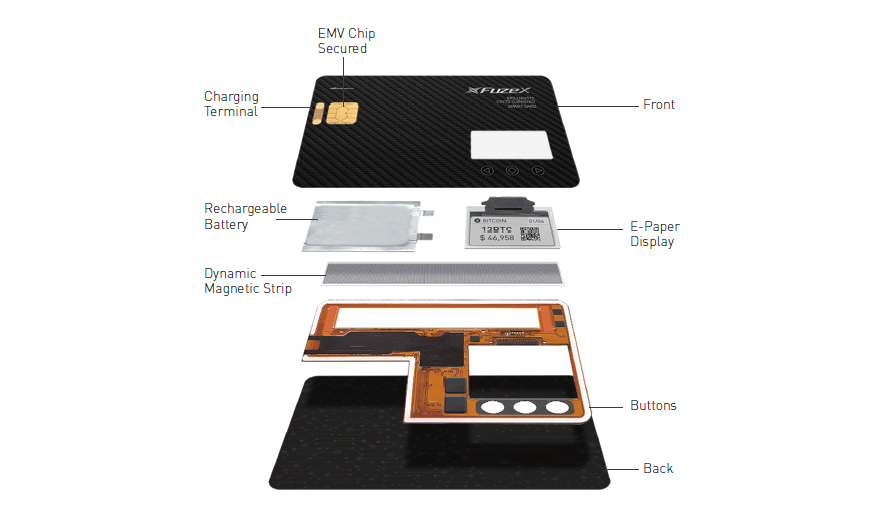 special features of the fuzex card are Store, manage and use up to 30 credit, debit, reward and cryptocurrency accounts. manage payments, select and authorize fuzex card itself. fuzex card is connected to wallet by Bluetooth. you can check your balance easily by E-Paper display.