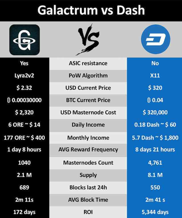 Galactrum ORE (Genesis Block Dec, 2017) is an improved Autonomous Digital Currency forked off Dash platform.