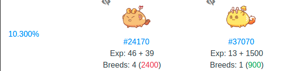 I chose two 5/6 beast axies that have “nut cracker” parts. The first one with has the tail and the second one the mouth and ears parts. Using freak tool, you can see that my probability to get a pure beast with those two axies is 10.3%.