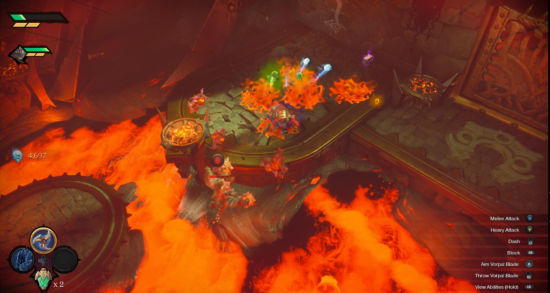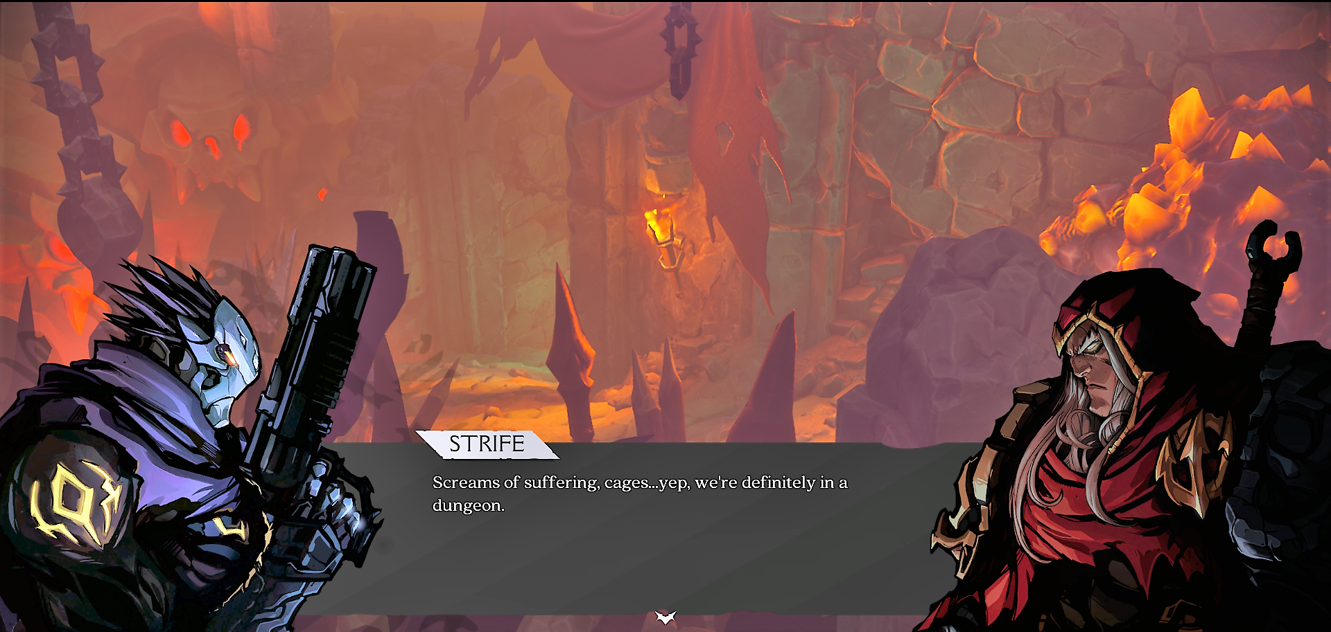 Aside from the camera change, in this game you play not as one, but TWO horsemen. Those of you who played the original Darksiders will recognize the voice of War as Liam O'Brien, who also did the voice of Illidan from World of Warcraft (he does a fantastic job in both of these roles). While I didn't recognize the voice of Strife - Chris Jai Alex, his past work apparently includes Hunter x Hunter, JoJo's Bizarre Adventure, and One Punch Man. The dynamic between them plays a bit like a buddy cop movie - War being the grizzled stoic type, and Strife coming off as a rogue-ish Han Solo type - and their combat style reflects this.