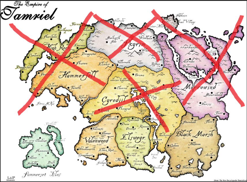We are shown a fairly vast stretch of land and not a single "small village" or "grim fortification" is shown. And they are said to"dot the landscape". Next I'll point out that it is said to be varried geologically but is never mentioned as being barren of trees. I've watched the video repeatedly and while I may have missed some, I can only see a single tree in the entirety of the video. What place is known as being made up of Savannahs(treeless lands) and badlands? Elswyr, the home of the race of cat men known as Khajiit. Much more obvious than all that I'd like to point out that while we are never told that Nirn's(Nirn is the planet the games take place on) GeoCliamte is similar to that of earth we are led to believe by skyrim, and it's main DLC, that the farther north you travel the colder and by proxy snowier it gets. Forgive me if I'm wrong but the landscape depicted appears borderline tropical and High Rock sits as far north as Skyrim. My most coroborative piece of evidence as to why it's not as likely to be High Rock is a simple one.... they already had a game take place in High Rock. Elder Scrolls II: Daggerfall. It's not impossible to think the next game could be a return there but it just seems more likely that they would send us to an unexplored location instead. I still hope it's Elsweyr but no matter where it takes place it will surely be a game changer. Oh and if you're interested here is a map of Tamriel with red X's over each place we've already visited in previous games.(excluding Arena and ESO as they've both technically included the entirety of Tamriel.)