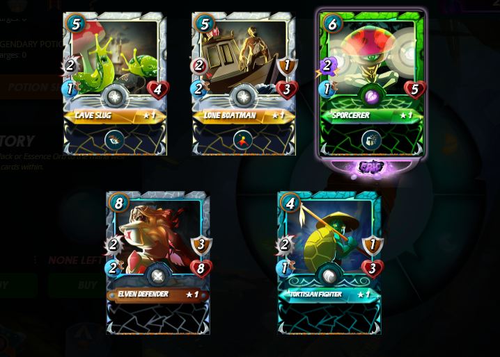 The design is great. There's a complete difference in the way light and shadows are handled on each monster which grants a different sense of dept and focal points; more appealing design for sure. I got 4 normal and one Epic card. That violet one is like an evolution of mushroom seer now a Sporcerer! and that new skill of reducing shields comes in handy against life splinter.