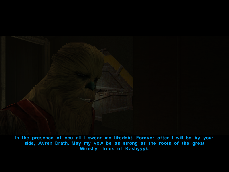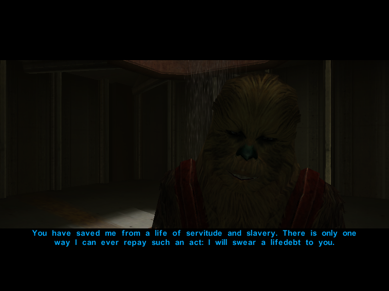 "This is an issue of great importance to me. Because of our great physical strength, Wookiees are being used as slave labor on our own homeworld. They see us as brutes and animals to be exploited. Over the years slavers have taken many of my people; we must always be on guard against raids against our villages. When the Gamorreans captured me, I thought I was doomed to a life of servitude. I have been saved from such a fate, and the only way I can repay that is through a lifedebt."
