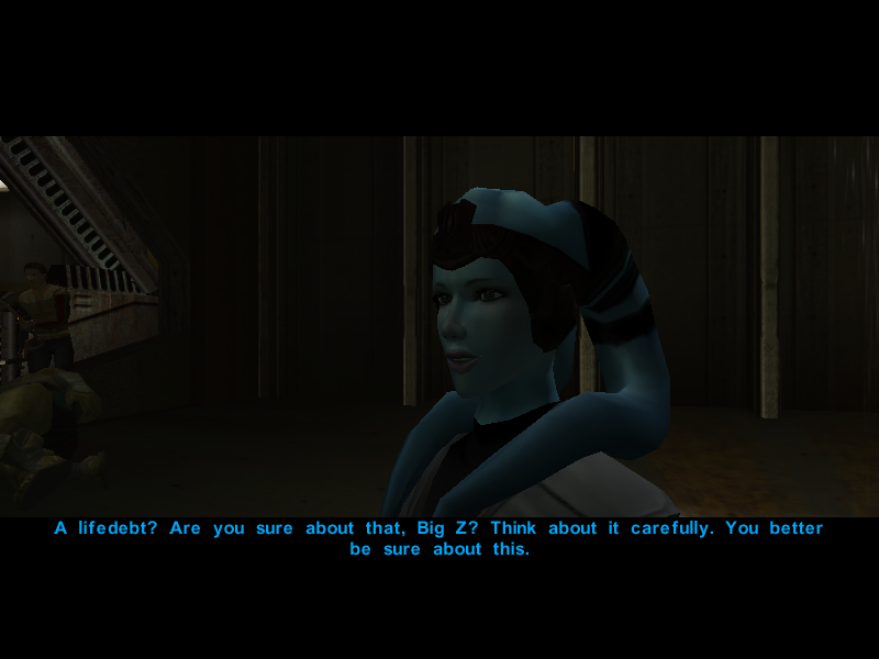 "So if I understand this right..." Says Carth "By rescuing you from a life of servitude you decided to pledge yourself into a life of servitude?"