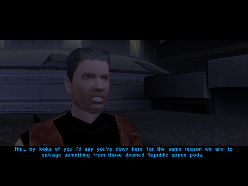 "Davik sent me down here with this motley crew to scavenge whatever we could from the Republic escape pods that crashed during the recent battle overhead. But the Lower City gangs got here first. Anything worthwhile in those Republic pods is probably in their hands now. Davik won't like that."