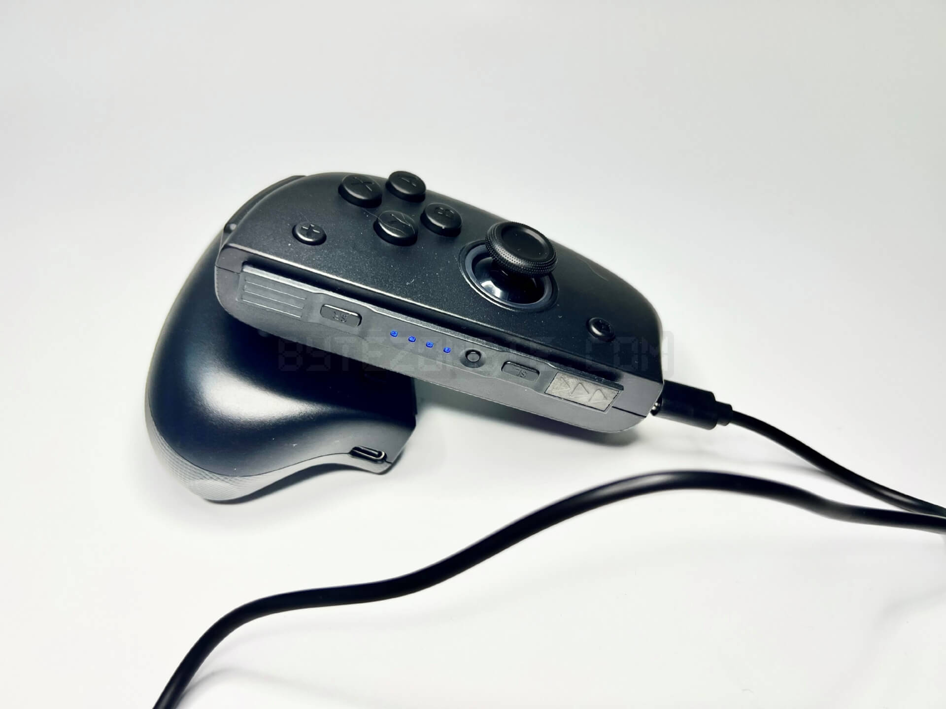 Charging is handled via USB-C ports at the bottom of each Joy-Pad meaning that they need to be charged individually if using a cable. I tested charging via Joy-Con charging dock and connected to the switch in docked mode (it fits just fine), both seemed to charge the controllers simultaneously. The analog LEDs light up momentarily when charging. This is reasonable and I always have them connected to my Switch anyway.