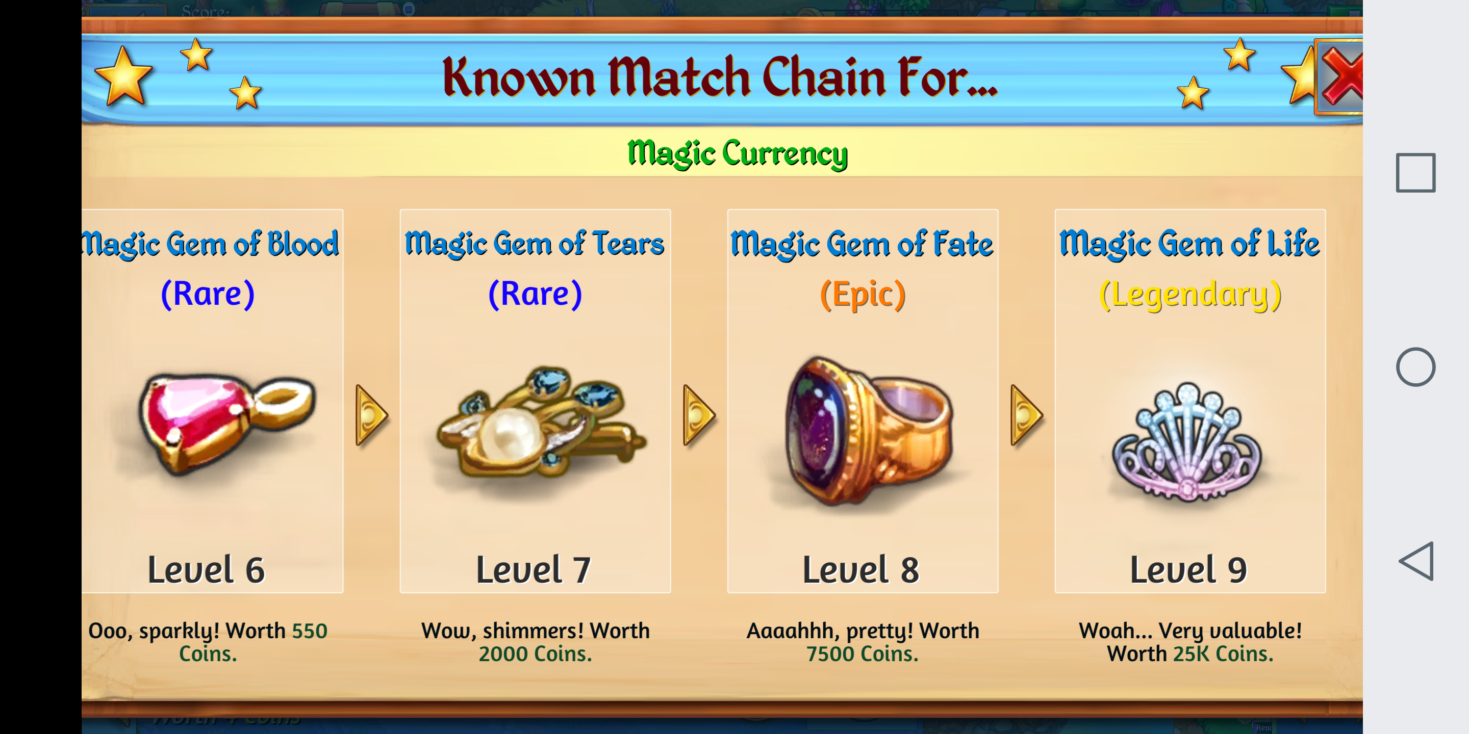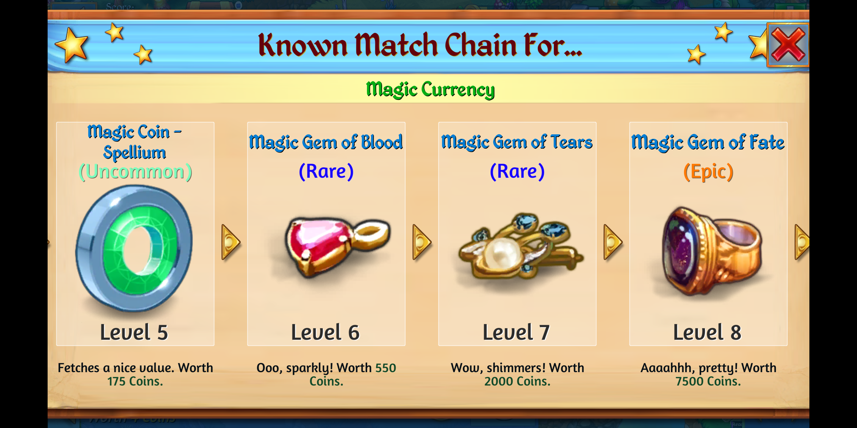 Tiny Magic coin (Common) -> Magic coin - Bronze (Common) -> Magic coin - Silver (Common) -> Magic coin - Gold (Uncommon) -> Magic coin - Spellium (Uncommon) -> Magic gem of Blood (Rare) -> Magic gem of Tears (Rare) -> Magic gem of Fate (Epic) -> Magic gem of Life (Legendary)