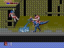 The game is a beat 'em up style where you have to defeat all enemies on the screen to advance to the next one. Plays with two buttons, one to jump and the other to attack, you can also do an aerial attack if in mid-jump you attack, finally you do your magic attack by pressing both buttons at the same time, you deplete your magic meter and do the attack to all enemies at the same time. There are enemies ridding animals that you can knock out and jump into the animal to ride it and the attacks change depending on which animal you are ridding on. You get three lives and one continue, when you get hit and knock down you lose one health, there are 3 health points in every life so in essence you can be knocked down up to 9 times before you use your continue.