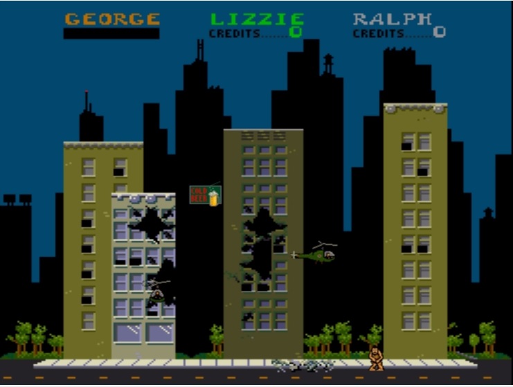 The game is kind of a beat 'em up in that you have to punch everything, but doesn't scroll instead every level consist on one screen and your goal is to find food in the buildings that replenish your health and destroy all the buildings on the screen to advance to the next "day". Your enemies are soldiers, choppers, tanks and police cars. Your enemies are going to shoot at you bullets and bombs to damage you, you have a life bar and when it empties you lose, you only get a life in every credit and there are 768 different levels, so it's basically infinite and you are playing for a high score. Once you lose there is a great animation when you turn back into a human and get naked to the side of the screen. The best thing about the game is that you can play with 2 other players cooperative which adds a lot of fun.