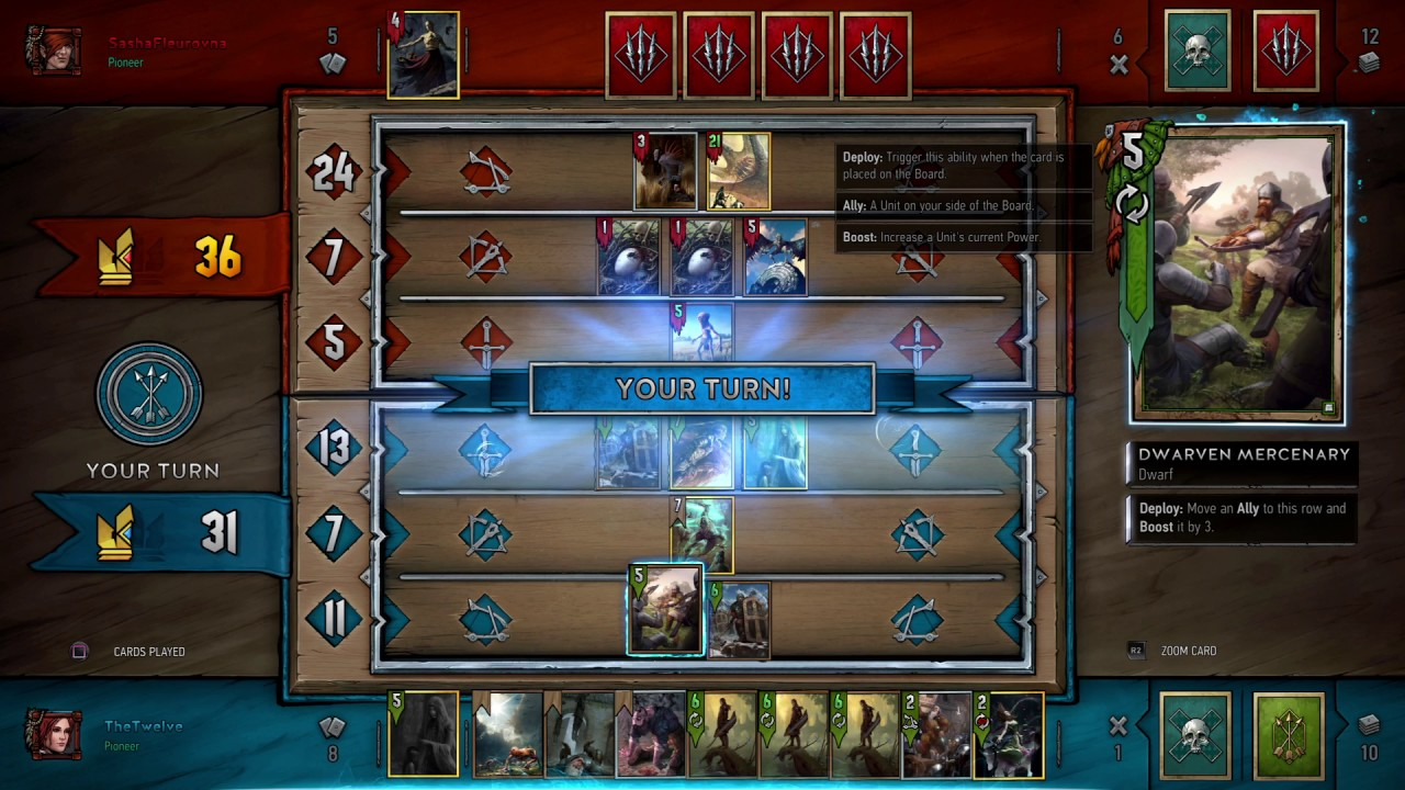 Very specific thing about Gwent is win conditions, match consists of maximum of three rounds and a player to win two rounds wins the match. If you combine this with a fact that you dont draw card each turn, but rather recieve 11 cards at beggining (can redraw 3 at the start of turn) and then 2 cards at beggining of 2nd and 1 card at start of 3rd round (2. and 3. round you only redraw one card) you get very strategy intensive and decision oriented game. Playing cards does not cost anything and you can play only one a turn. There of course is some RNG but in very healthy portion, it is adding more fun and unexpected outcomes then in RNGstone where it almost rendered game unplayable.