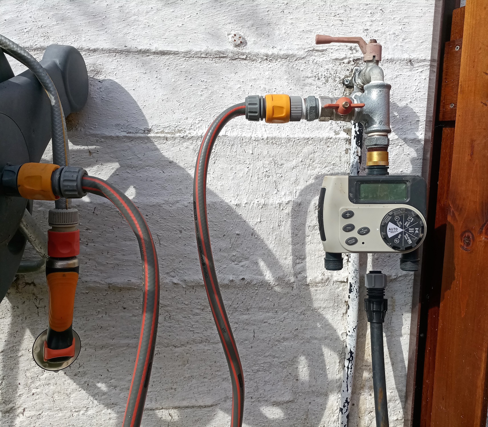 Finally, I bought this great double automatic irrigation system programmer. I use one program for the vegetables and another program for a second underground line for the trees: