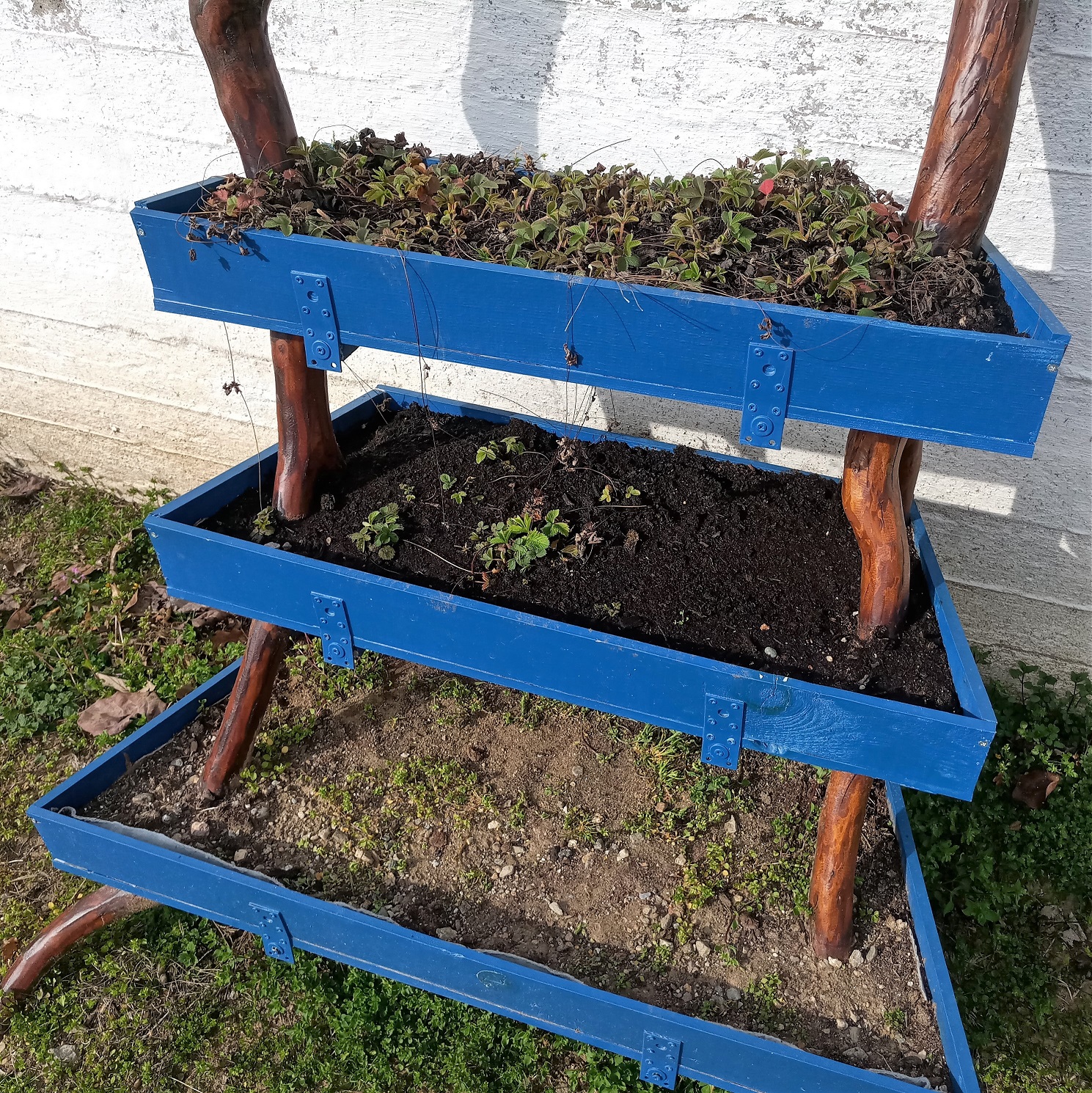 I also planted my own musk strawberries from seeds. I didn't had any strawberries last year, but I might have some this year. The plant just woke up from the winter sleep and I made this special bed for those: