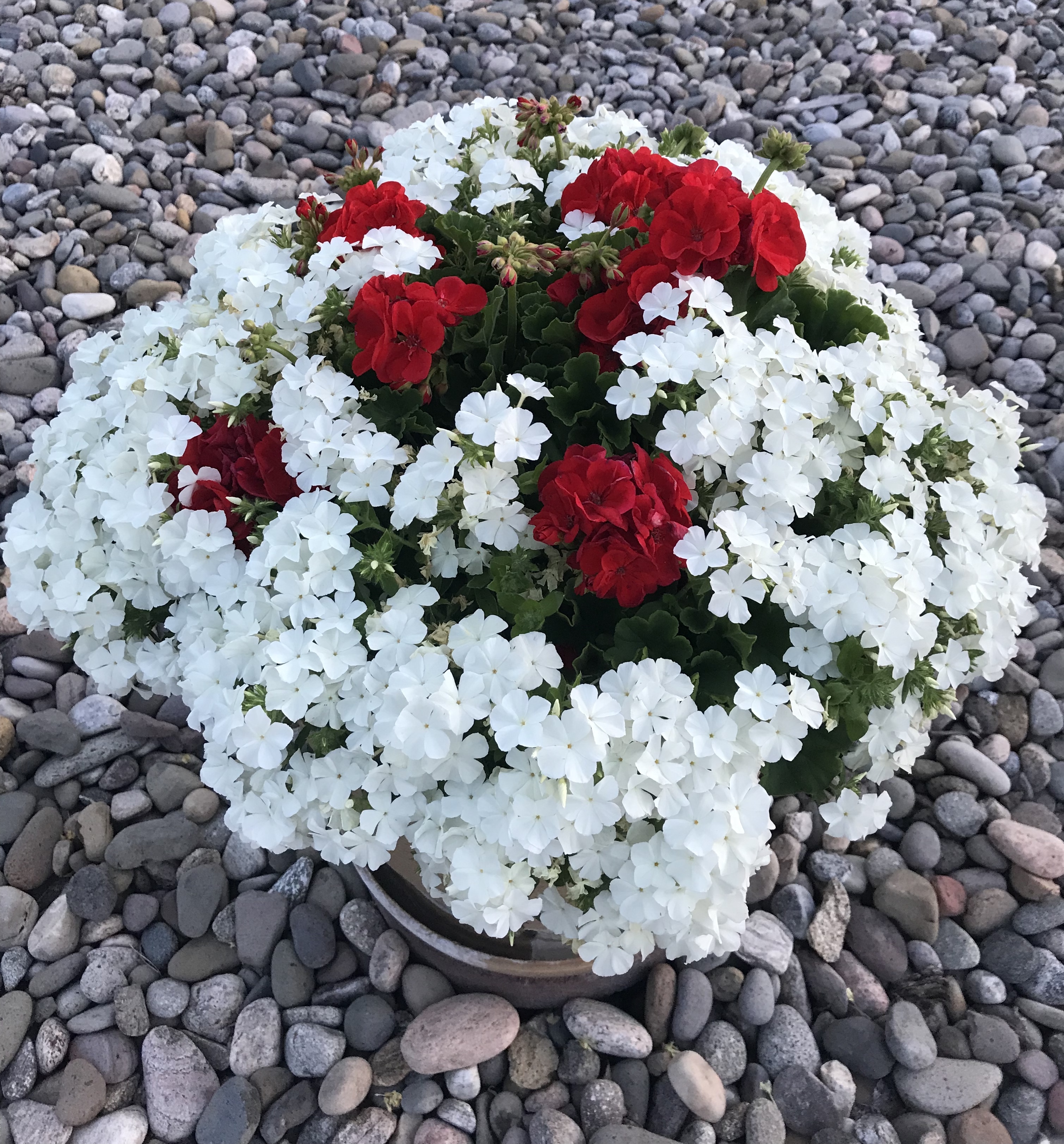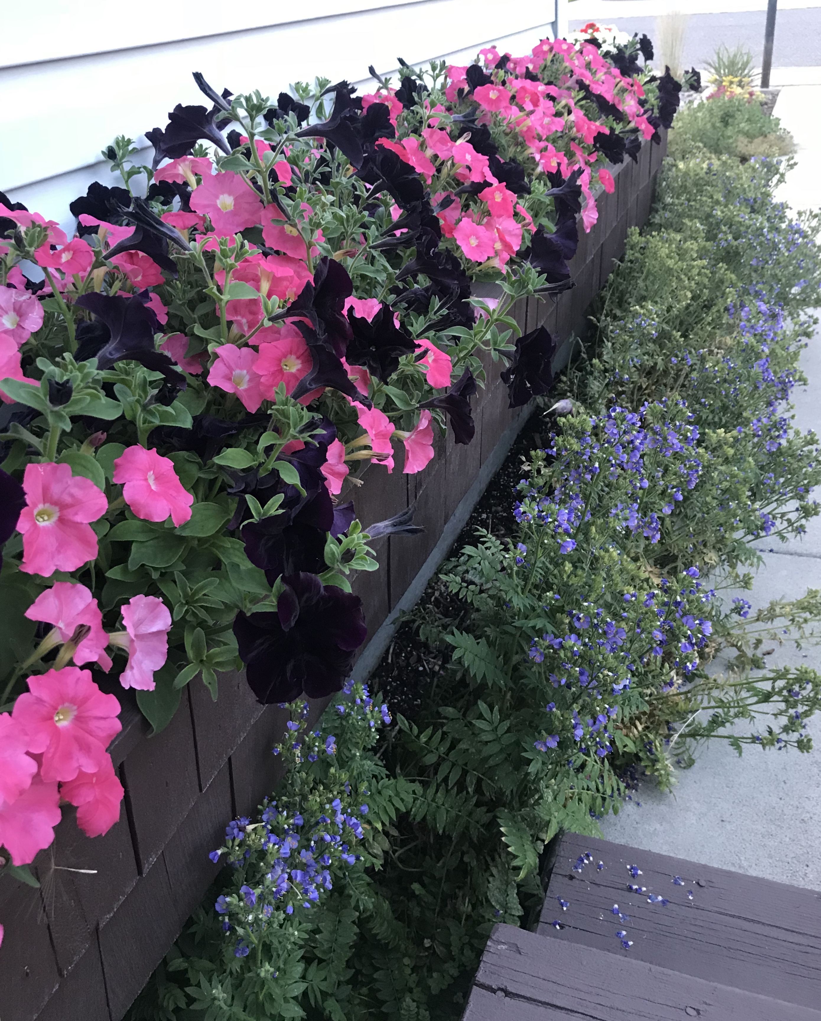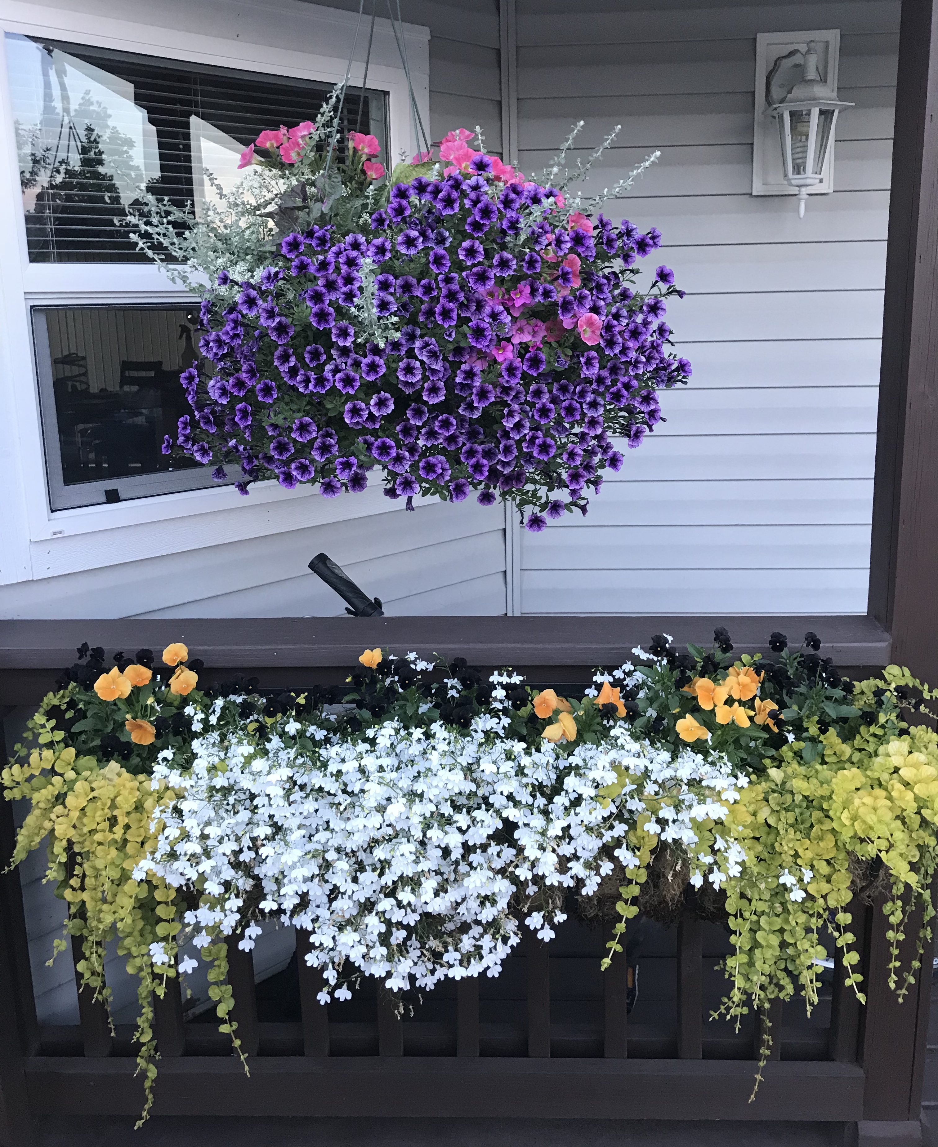 Here are my annual planters... bursting! The Jacob’s Ladder (under Petunia’s with purple flowers) is done blooming mostly. But everything else is amazing!