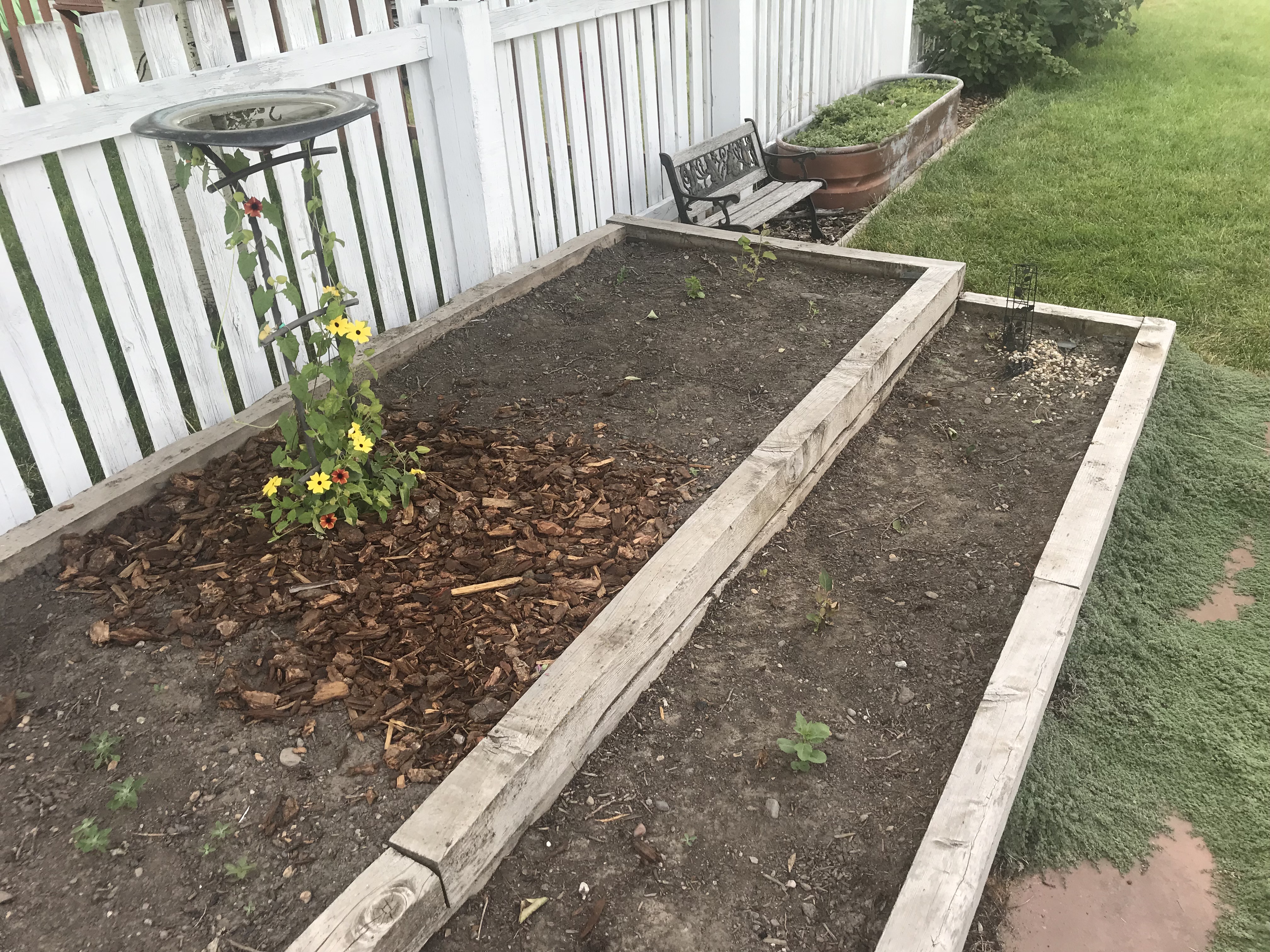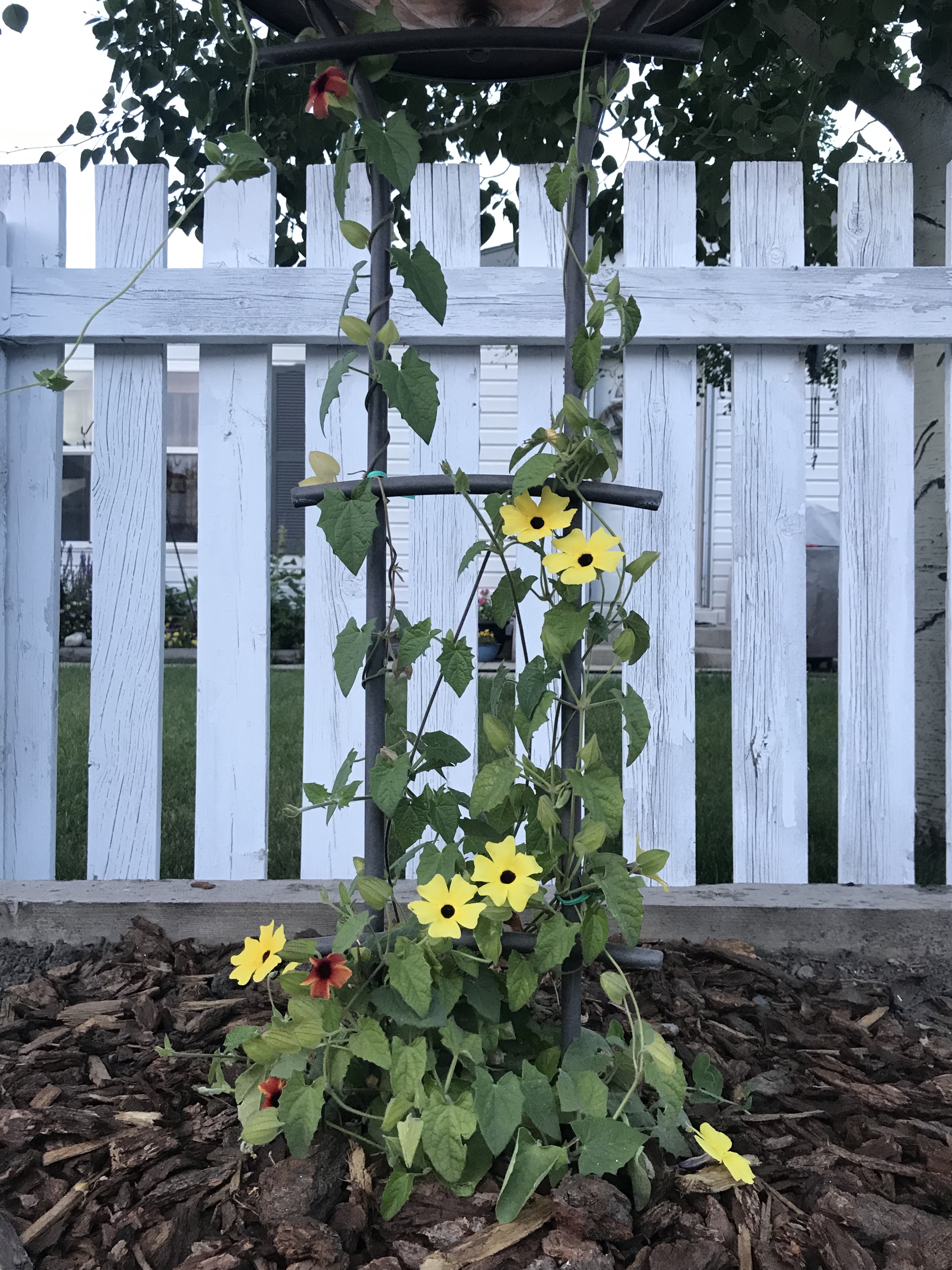 I did not plant my veggie garden this year, but it’s growing some great weeds, Poplar trees and a bonus Sweet Pea or two from last years plants. A frost killed the 2 tomato plants I had. I did manage to at least plant some Black Eyed Susans under the bird bath. Can’t have birds bathing with no beauty around them ya know.