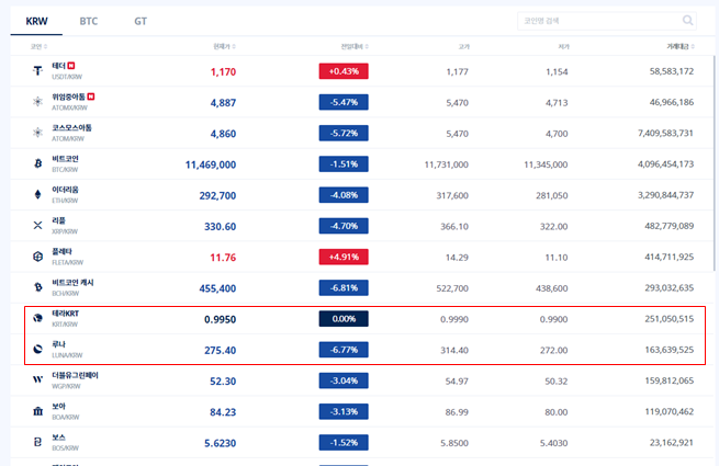 루나는 업비트, 코인원, 빗썸, 지닥, 쿠코인 등 여러거래소에 상장되어 있습니다.