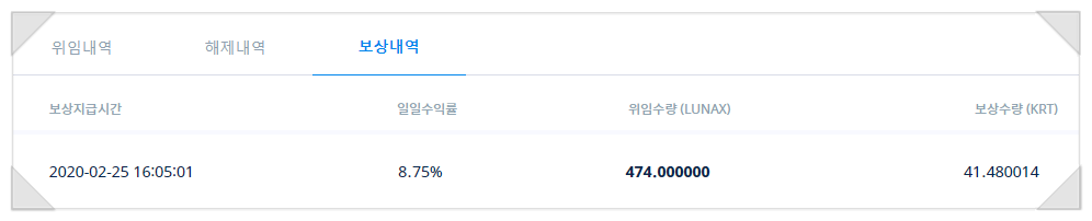 위임한 루나의 수량이 474개 보상은 41KRT, 일 수익률 8.75% 코인원의 3~4배정도 돼죠?