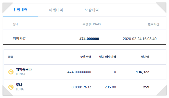 여튼, 정말 3시 땡하자마자 위임신청하구 대기하니 4시 8분쯤 위임이 완료 되구 위임중루나(LunaX)가 잔고로 들어왔었어요.