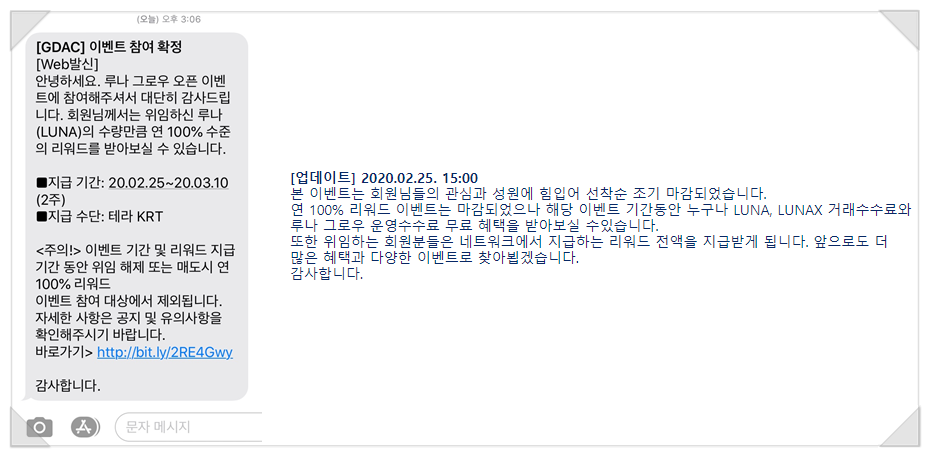 루나 100% 리워드 이벤트는 조기 종료되었고, 문자 받은 분들에 한해서 이벤트에 참여가 되는데요.