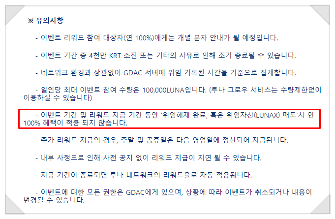 이벤트에 참여한 루나의 경우는 이벤트 기간동안 위임해제 또는 매도시 대상자에서 제외 된다고 하니...