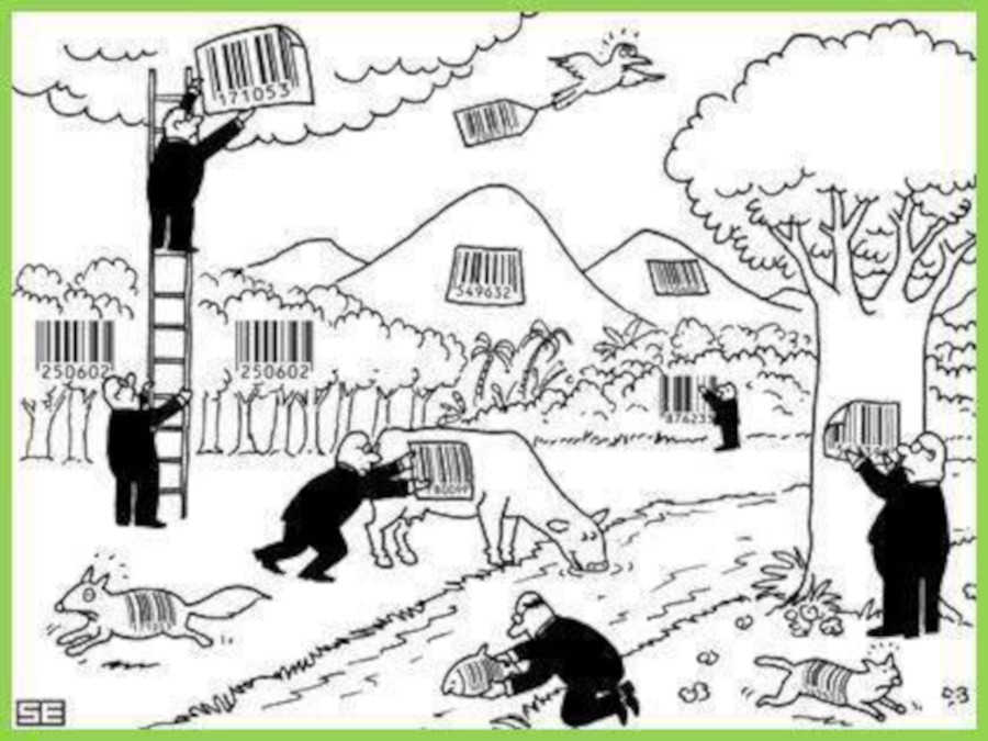 I would say who drew this caricature several years ago was reflecting on the frenzy that started at the end of the last century in tagging items which makes it easier to count them in the inventory taking and track their movements which swiftly moved to tag livestock and wild animals, some used the tagging to monitor the behavior of the tagged living organs, their reaction to the events surrounding them, and even their overall living, and living cycle: