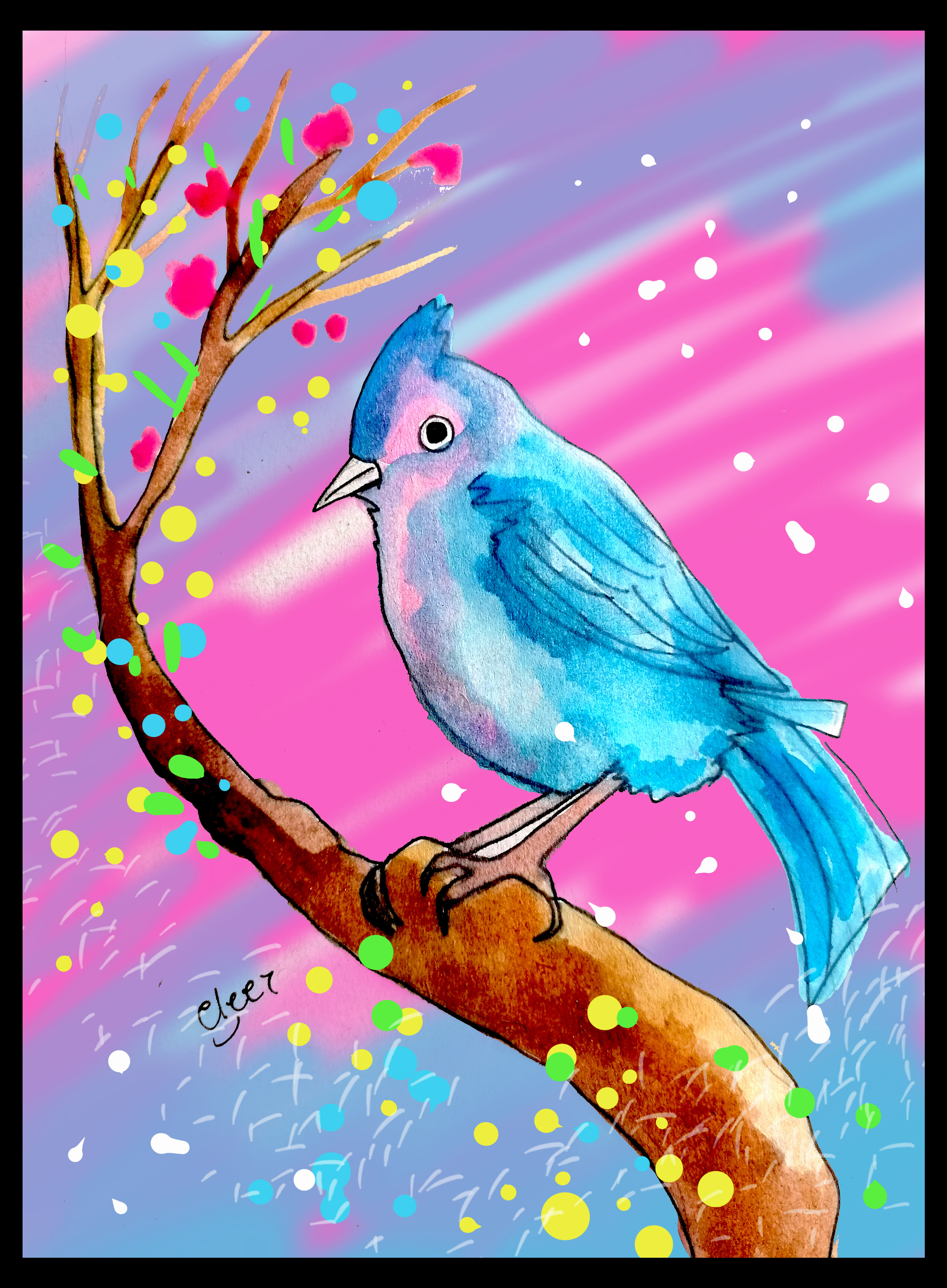 i have a new painting , beautiful blue bird , on the tree , in this sunny and he looks very happy :). i draw it on gray paper and colored with watercolors , and use a painting program to put vibrant colors on it . now you can see how i paint it with watercolors step by step