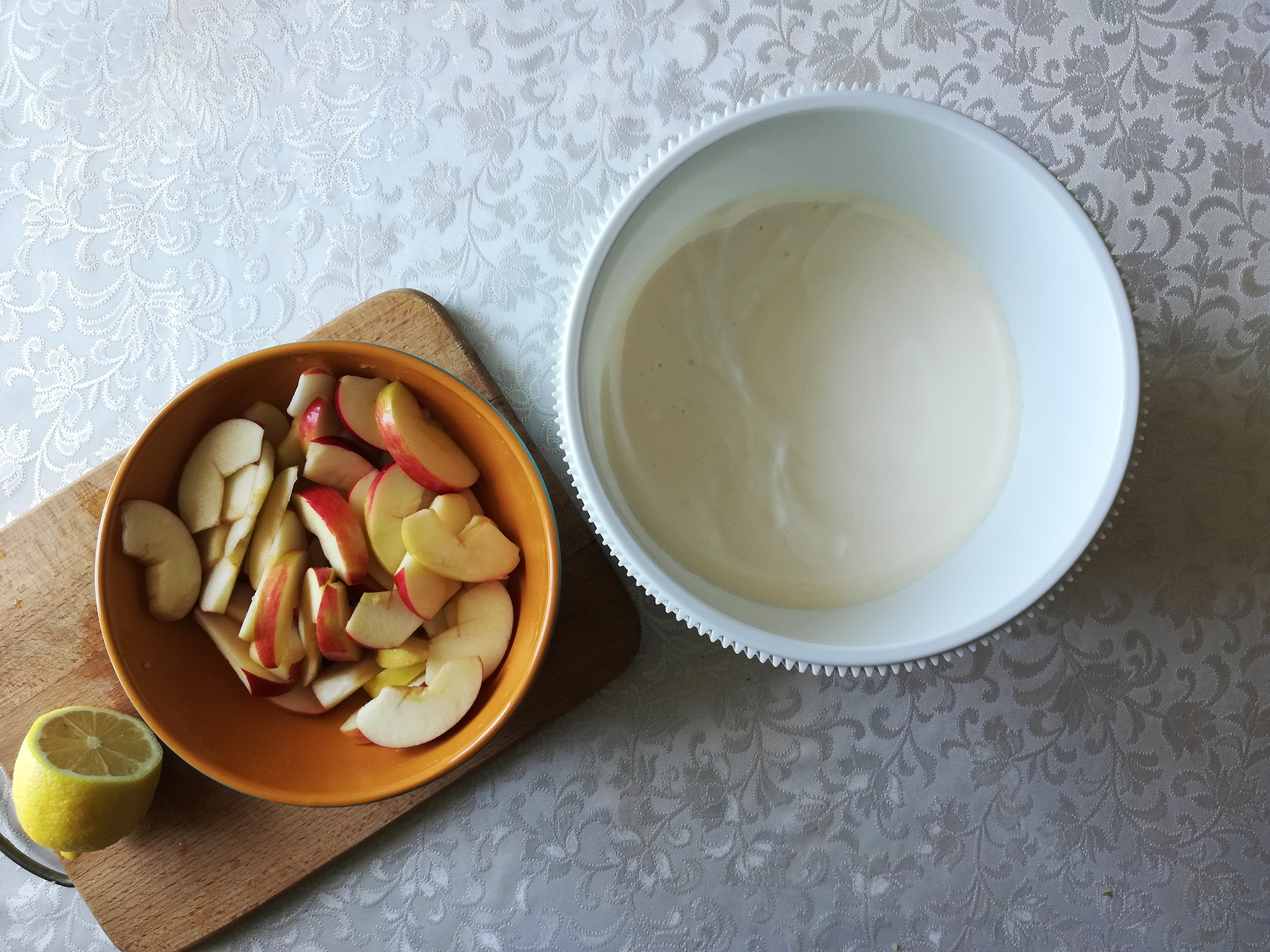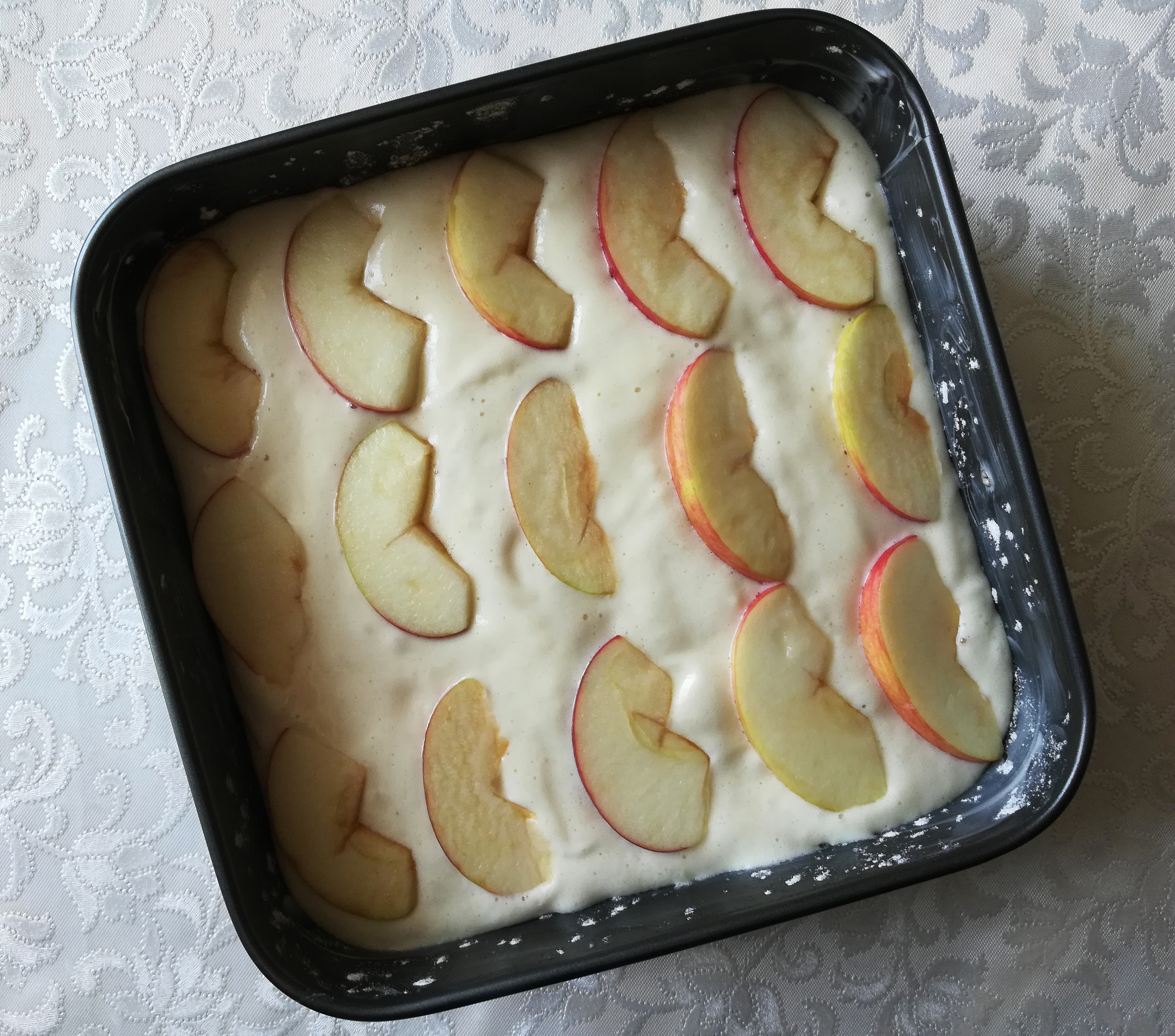 Форму смазать сливочным маслом, присыпать мукой, налить половину теста и выложить половину яблок.