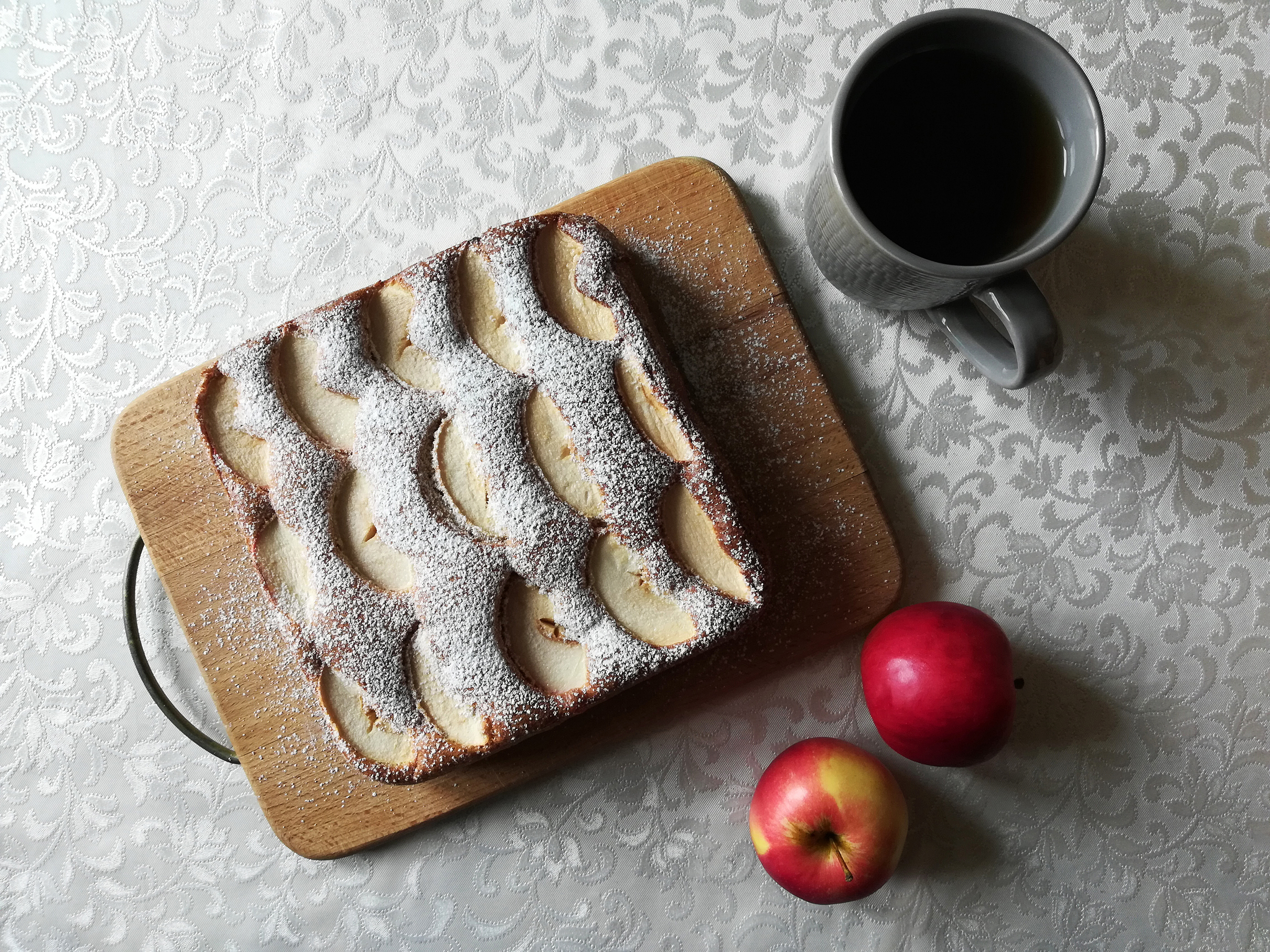 Налить вторую часть теста, выложить оставшиеся яблоки. Отправить в заранее разогретую духовку до 180°С на 35-40 мин. В процессе выпекания духовку не открывать. После того, как шарлотка будет готова, выключить духовку, не открывая дверцу, оставить остывать на полчаса.