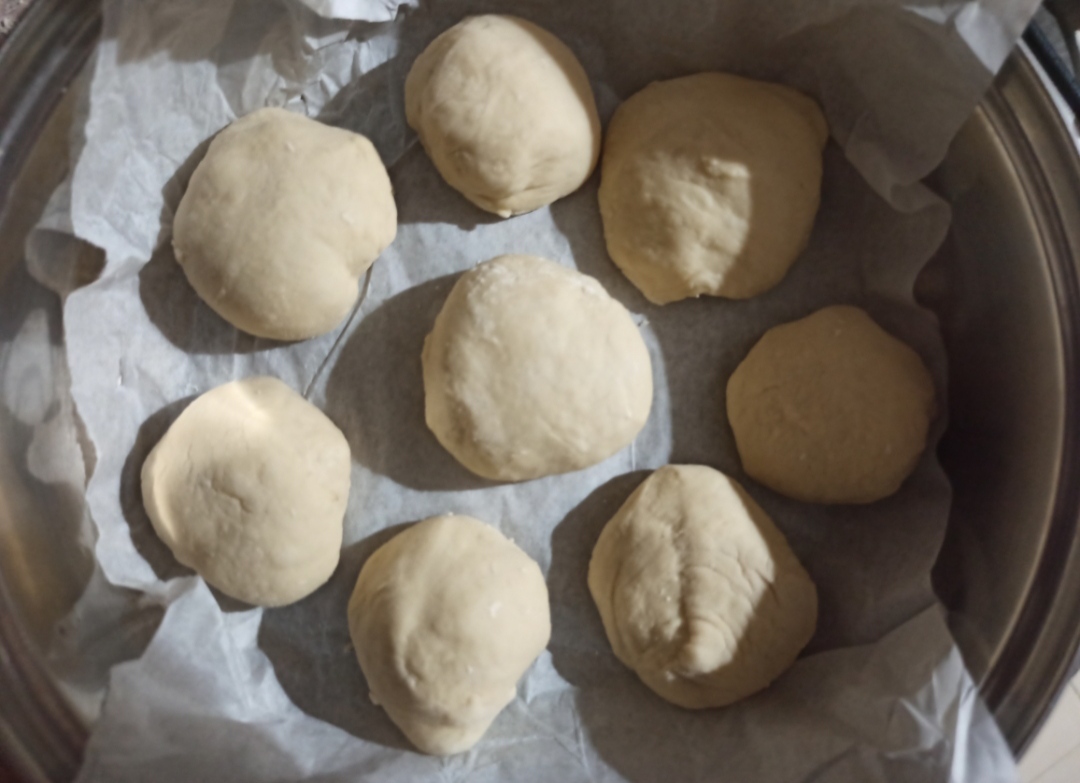 Already with our 8 pieces, what we will do is give it a round shape and we will place this in a non-stick pan, if they do not have a non-stick pan you can use baking paper before placing the breads directly in the pan.